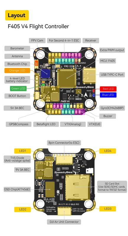 Тільки польотний контролер SpeedyBee F405 V4 FC Технічні характеристики Контролер польоту SpeedyBee F405 V4 MCU: STM32F405 IMU (гіроскоп): ICM42688P Тип порту USB: Type-C Барометр: вбудований Аналоговий чіп OSD: AT7456E BLE Bluetooth: підтримується (використовується для конфігурації контролера польоту, увімкнено MSP зі швидкістю передачі 115200 бод на UART4) WIFI: не підтримується 6-контактний роз'єм HD FPV: сумісний із DJI O3/RunCam Link/Caddx Vista/DJI Air Unit V1/Walksnail Avatar Гніздо для карт MicroSD Blackbox: підтримує SDSC і SDHC до 32 ГБ. Потрібен формат FAT16 або FAT32. Вхід датчика струму: підтримується. Для SpeedyBee BLS 55A ESC масштаб = 400 і зміщення = 0. Потужність: 3S - 6S Lipo. 6 UART 5 В BEC Вихід 3 А. 9В BEC Вихід 3А. Вихід 3,3 В BEC 500 мА. 4,5 В BEC Вихід 1 А. 8 сигнальних виходів двигуна ESC: M1 - M4 на нижній стороні та M5-M8 на передній стороні. Телеметрія ESC: UART R5(UART5) I2C: підтримується Світлодіодна панель: підтримується Buzzer Pad (BZ+ і BZ-pad): підтримується Доступна кнопка BOOT Вхід RSSI: підтримується Frsky SmartPort / F.Port: не підтримується Підтримуване мікропрограмне забезпечення контролера польоту: BetaFlight (за замовчуванням), INAV Цільова назва мікропрограми: SPEEDYBEEF405V4 Кріплення: 30,5 x 30,5 мм (діаметр отвору 4 мм, потрібні болти 3 мм через гумові гумки) Розміри: 41,6 (Д) x 39,4 (Ш) x 7,8 (В) мм Вага: 10,5 г