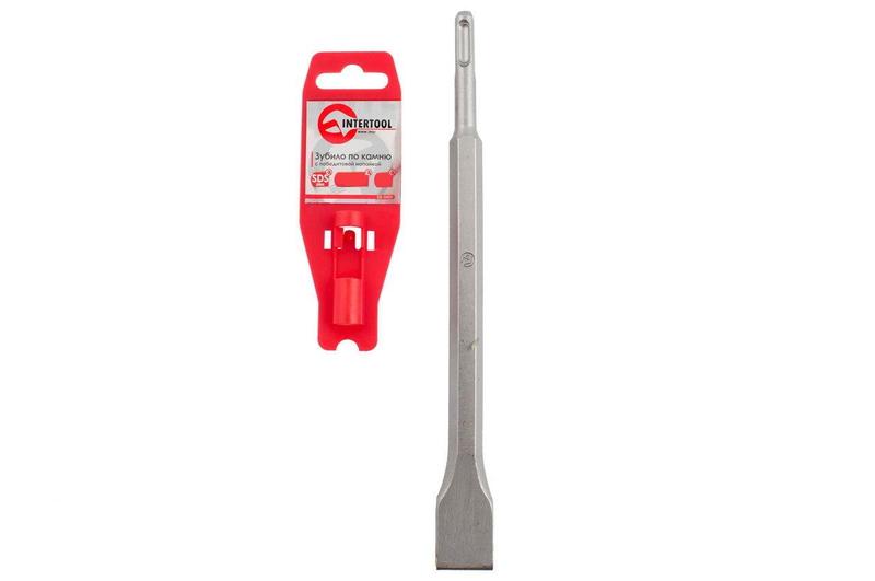 Зубило плоске для каменю "Intertool" з переможною напайкою призначене для демонтажних робіт і буріння міцних абразивних матеріалів, як-от цегла, бетон, піноблок, камінь тощо. Хвостовик — SDS+, діаметр стрижня — 17 мм, довжина зубила — 400 мм, ширина робочої частини — 25 мм. Тип кріплення: SDS Plus