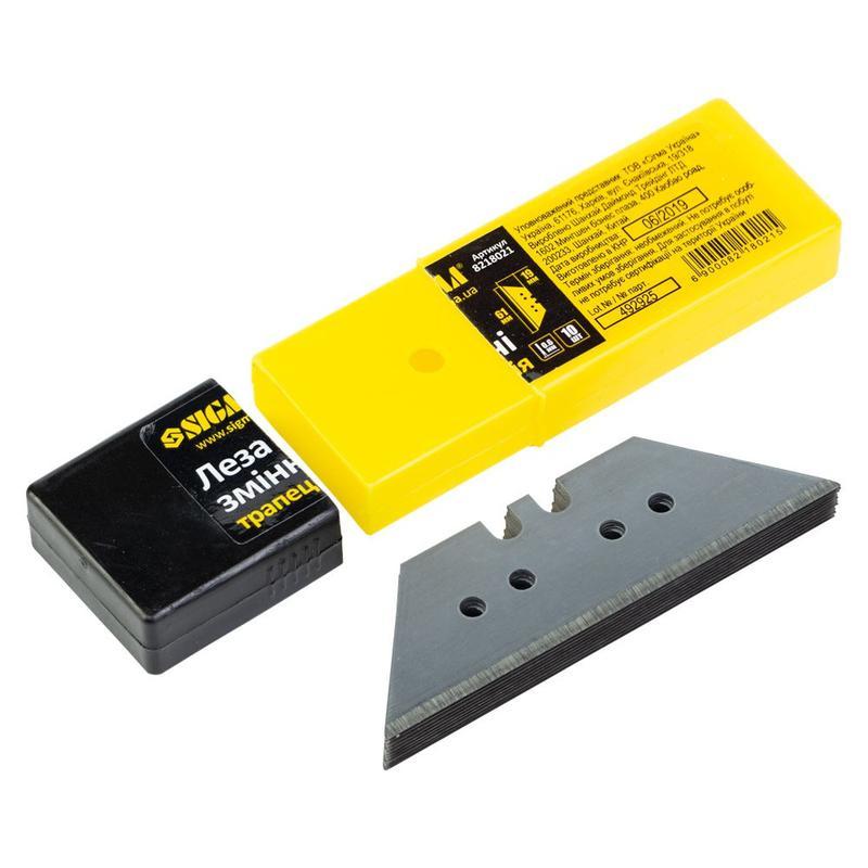Тип інструмента: Інший вид інструменту Кілька примірників у наявності Леза змінні (трапеція) 61×19×0.6 мм з отворами 10шт Sigma трапецієподібної форми призначені для заміни лез в малярних ножах від ТМ SIGMA. Універсальна конструкція і спеціальні отвори дозволять швидко і якісно провести заміну і ремонт. Високоякісна заточка забезпечить довговічність виробів.