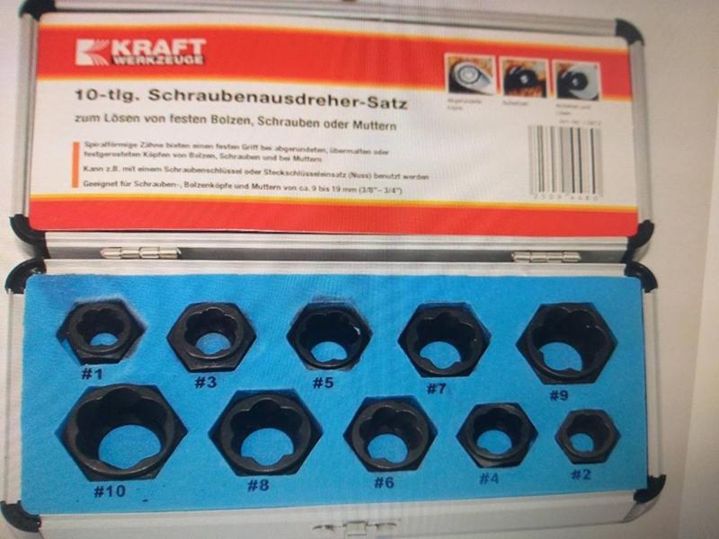 Набір екстракторів для зламаних гвинтів Kraft Werkzeuge/Німем/-10 шт., новий Екстрактори призначені для відгвинчування захоплених болтів і гайок. Вони також можуть використовуватися для відгвинчування пошкоджених болтів гайок і штифтів. Головки можуть використовуватися для ослаблення правого гвинта та гайок. Екстрактори для пошкоджених, підданих механічної обробки болтів, гайки розмір**********, 14, 15, 16, 17 і 19 мм мають спеціальну форму, що дає змогу заклинювати на пошкодженому болті або гайці, завдяки чому видаляється пошкоджена деталь. Екстрактори працюють із храповим механізмом 3/8", який дає змогу точніше контролювати послаблювальне зусилля, ніж у разі храпового механізму 1/2" Екстрактори також мають можливість використовувати їх з іншими інструментами. Продукт полегшує роботу в професійних механічних і автомобільних службах, дає змогу скоротити час роботи та захистити інші елементи гвинтового з'єднання від пошкоджень. Технічні характеристики: Паковання: алюмінієвий кейс Размер [мм]: 9, 10, 11, 12, 13, 14, 15, 16, 17, 19 Розмір привода [дюйм]: 3/8"-3/4 Довжина [мм]: 27 Кількість позицій [шт.]: 10