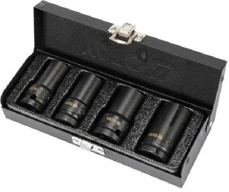 набір ударних головок для демонтажу кріпильних болтів YATO YT-06030 призначені для демонтажу сильно пошкоджених болтів і гайок. Рекомендуються для професійних автосервісів і майстерень. Характеристики: - виготовлені з твердої сталі CrMo стійкою до пошкоджень - кількість в наборі: 4 головки - розміри: 17, 18.5, 21.5, 26 мм - довжина: 55 мм - квадрат: 1/2" - паковання: металевий кейс Міцність, досконалість виконання, виняткова надійність, відмінні матеріали, сталь високої якості і технічні особливості продукції YATO (Польща) дозволяють з успіхом використовувати її у багатьох областях промисловості, у сфері обслуговування, будівництві та домашньому господарстві.