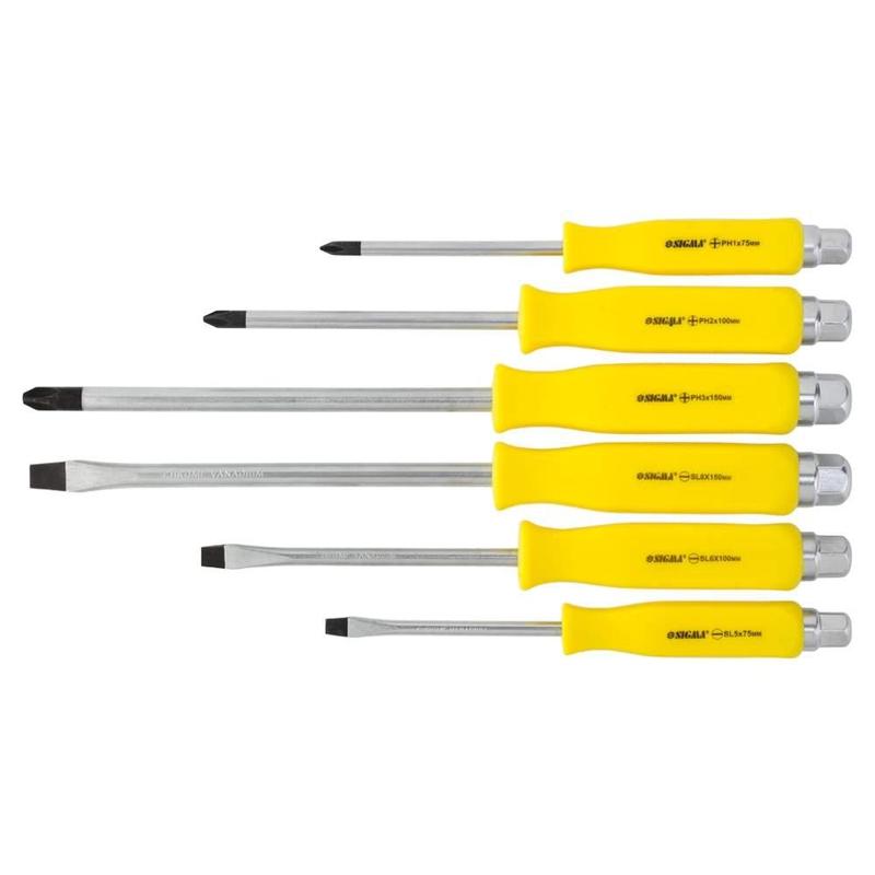 Набір викруток ударних під ключ 6шт CrV SIGMA (4001141) призначений для відкручування заржавілих і прикипіла гвинтів і саморізів. Всі викрутки мають ударостійку рукоятку з посиленим для затягування ключем підставою, стрижень виготовлений з високоякісної хромованадіевой стали оснащений оксидованим магнітним наконечником. Особливості: - Crv сталь; - Магнітний наконечник; - Під ключ. 6 предметів: - SL5×75 мм, SL6×100 мм, SL8×150 мм; - PH1×75 мм, PH2×100 мм, PH3×150 мм. ОСНОВНІ ХАРАКТЕРИСТИКИ Торгова марка:Sigma ТЕХНІЧНІ ДАНІ Матеріал:Хромванадієва сталь Особливості:Магнітний накінечник, під ключ ГАБАРИТНІ РОЗМІРИ Розмір:РН1×75 мм. РН2×100 мм. РН3×150 мм; SL5×75 мм. SL6×100 мм. SL8×150 мм ПАКОВАННЯ ТОВАРУ Тип упаковки:PVC пакет з заклепками