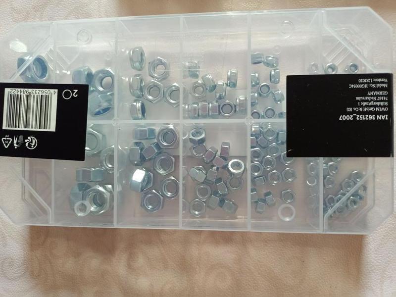 Шестигранные гайки - оцинкованные. Наиболее распространенные размеры: M4, M5, M6. M8. M10, M12 (включая 42 самоконтрящиеся гайки) Ящик для хранения прозрачный 128 шт.