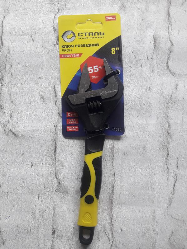 Сталь 41095 Ключ розвідної тонкої губки Profi 200 мм Ключ розвідної тонкої губки Profi 200 мм Сталь для сантехнічних і слюсарних робіт, в авторемонтних майстернях і під час монтажу/демонтаже обладнання. Висока якість інструмента. Виготовлений зі сталі зі спеціальним захисним покриттям чорного кольору. Ручка ключа додатково покрита термопластичною гумою, вона приємна на дотик і не ковзає в руці. У ньому збільшене захоплення зіва до 50%, порівнюючи зі звичайним розвідним ключем. Має тонку головку, що дає змогу використовувати його в обмеженому просторі, менший кут нахилу головки всього 15° забезпечує більшу швидкість у роботі та точність. Захоплення 0-38 мм. Довжина ключа -- 200 мм. ##