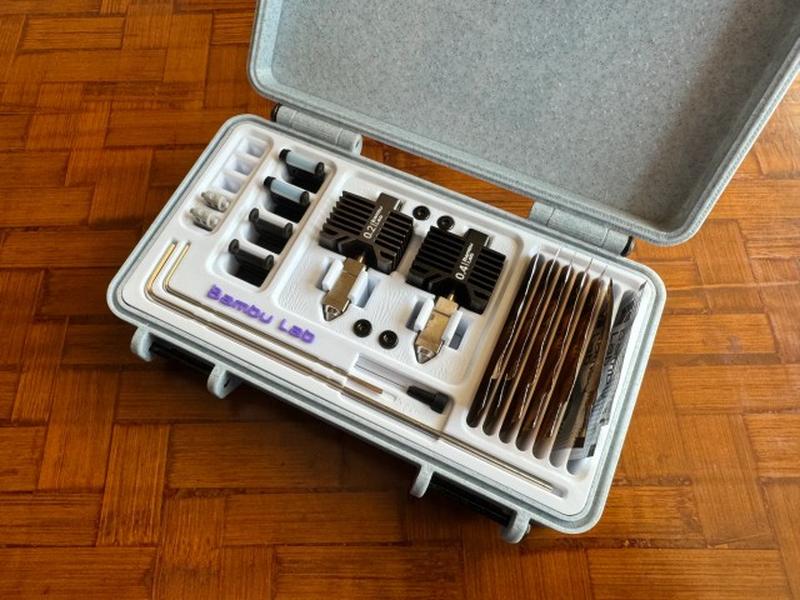 Це міцна коробка для основних інструментів і аксесуарів X1/P1 для зразків ниток Можуть бути розміщені такі частини: -Два наконечники + два кріпильні гвинти -Чотири форсунки склоочисника + два кріпильних гвинти -П'ять ниток різак - Штифт насадки - шестигранний ключ -Сім мастила і термопаста