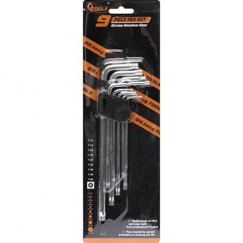 Набір шестигранників. Шестигранний ключ - ручний інструмент, призначений для роботи з кріпильними елементами, що мають шестигранний шліц. Як правило шестигранні ключі виконуються у виді Г-подібного загнутого шестигранного стержня. Шестигранні ключі широко застосовуються в машинобудуванні, автомобільній промисловості, при складанні меблів. У наборі 9 зіркоподібних шестигранників діаметрами: 1,5 мм; 2,0 мм; 2,5 мм; 3,0 мм; 4,0 мм; 5,0 мм; 6,0 мм; 8,0 мм; 10,0 мм. Довжина від 20,0 см до 9,5см