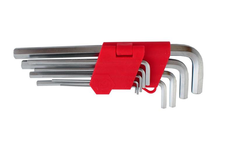 Типи ключів: Г-образні шестигранні подовжені; Кількість ключів: 9 од .; Розміри ключів: 1.5-10 мм; Твердість за шкалою Роквелла: 52-55 HRC