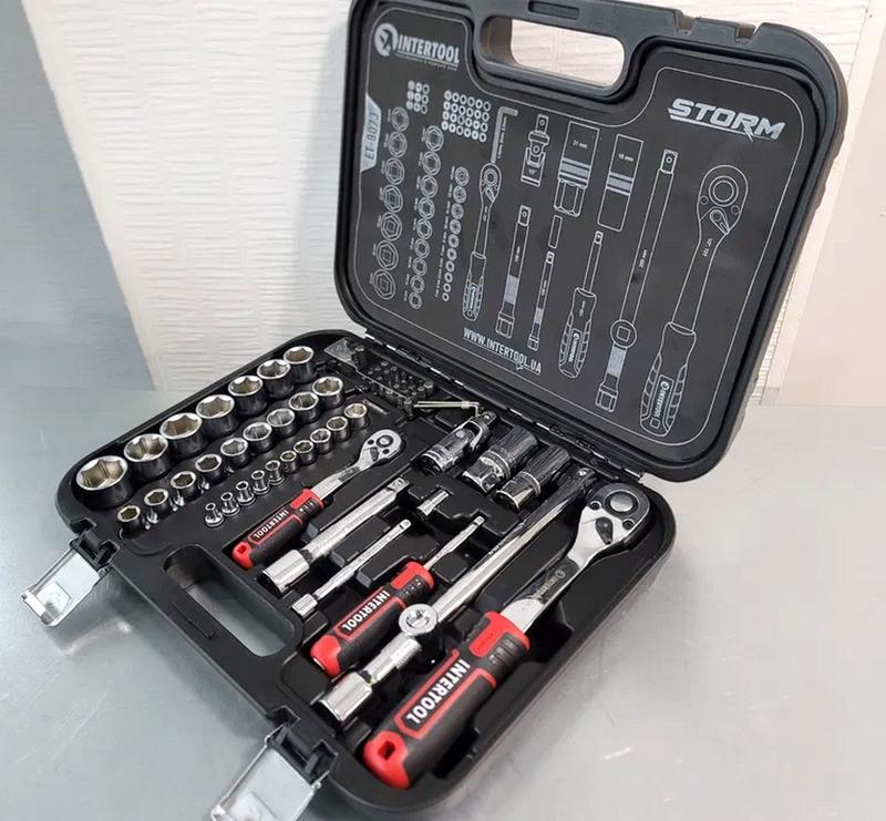 Набор торцевых ключей головок 73ед, Набор инструментов ключей рожково- накидных, NST Наборы инструментов INTERTOOL STORM - это новое слово в поддержку качества и многофункциональности! Благодаря своей практичности идеально подходят для автолюбителей и домашних мастеров. Широкий выбор инструментов позволяет справиться почти с любым видом крепежа, что очень выручает при внезапных поломках в дороге и во время ремонтных работ в гараже. Инструмент на любой случай Главная особенность набора в его комплектации. Здесь собраны все необходимые инструменты для замены свечей зажигания, тормозов и любой другой сложной детали автомобиля, расположенной в самых недоступных местах. В комплекте вороток, удлинители, головки и кардан, нужны для откручивания гаек, болтов и шпилек в глубоких колодцах двигателей или в местах, где сложно их достать. Две головки для снятия свечей зажигания (21 и 16 мм), позволяют заменить свечи на автомобиле любого производителя, включая и страны ЕС. Разнообразные биты (SL, PZ, PH, M, TORX, HEX) пригодятся для работы с различными видами шлицов, которые используют в мебельной промышленности, строительстве, машиностроении и пр. Удобные и надежные трещотки Все комплектующие механизма трещоток на 72 зуба изготовлены на о. Тайвань. Отличаются плавностью хода и имеют небольшой угол возврата - всего 5⁰, благодаря чему работает быстро и точно. Изогнутая форма трещотки позволяет достать крепежи в труднодоступных местах. Наличие реверса и быстрая смена головок упростят работу во множество раз! Головки туго сидят на посадочных квадратах 1/2", 1/4" и не спадают. Насечки на каждой головке улучшают сцепление с ладонью и не выпадают из рук. Сама трещотка удобно лежит в руке и имеет трехкомпонентное обрезиненное покрытие. Долговечность и износостойкость Головки и трещотки набора выполнены из флагманской и надежной стали Cr-V 50BV30. Отличаются исключительной прочностью и высоким показателем крутящего момента, устойчивы к деформациям. Двухслойное никелевое покрытие защищает от появления ржавчины, таким образом, инструмент служит гораздо дольше подобных аналогов! Биты изготовлены из стали Cr-V 6150, c отличными параметрами твердости и упругости. Противоударный кейс Инструменты упакованы в надежный и ударопрочный пластиковый кейс. Для сохранности и максимального срока службы инструмента, в чемодане предусмотрены специальные отсеки с фиксатором для хранения каждой детали в отдельности. Металлические замки уберегут кейс от случайного открытия. Ящик легко переносить и хранить, он компактный и не занимает много места (375*295*85 мм). Современный яркий дизайн кейса точно не оставит никого равнодушным! Комплектация * * * Трещоточная рукоятка 1/2", 72 зуба, реверсионная; Головка шестигранная торцевая 1/2", 16 шт.: 10, 11, 12, 13, 14, 15, 16, 17, 18, 19, 20, 21, 22, 23, 24, 27 мм; Головка свечная 1/2", 2 шт.: 16, 21 мм; Удлинитель 1/2", 125 мм; Кардан 1/2"; Вороток с плавающей головкой 1/2" - 3/8", 250 мм. Трещоточная рукоятка 1/4", 72 зуба, реверсионная; Головка шестигранная торцевая 1/4", 10 шт.: 4, 5, 5.5, 6, 7, 8, 10, 11, 12, 13 мм; Удлинитель 1/4" 100 мм; Держатель 1/4" для головок и бит 150 мм; Переходник для бит 1/4". Биты: TORX 8 шт.: T8, T10, T15, T20, T25, T27, T30, Т40; HEX 13 шт.: 3, 4, 5, 6, 8, 10, 1/8", 9/64", 5/32", 3/16", 7/32", 1/4", 5/16"; PH 4 шт.: PH0, PH1, PH2, PH3; PZ 3 шт.: PZ1, PZ2, PZ3; SL 3 шт.: SL4, SL5.5, SL7; Spline 2 шт.: M6; М8. Набор Г-образных шестигранных ключей, 3 шт.: 1.5 мм, 2 мм, 2.5 мм.
