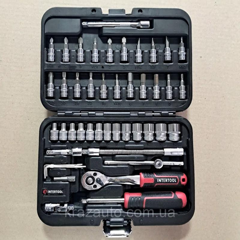 Інструмент для сто та автосервісу, Набір універсальних інструментів, Набори ключів інтертул 46ед, NST Набори інструментів INTERTOOL STORM — це нове слово на підтримку якості та багатофункціональності! Завдяки своїй практичності ідеально підходять для автолюбів і домашніх майстрів. Широкий вибір інструментів дає змогу впоратися майже з будь-яким типом кріплення, що дуже виручає під час раптових поломок у дорозі та під час ремонтних робіт у гаражі. Функціонал Комплектація набору з приводом 1/4" знадобиться для виконання переважної більшості робіт, пов'язаних із ремонтом обладнання, авто-, мото-, велотехніки, а також інших робіт у побуті та в гаражі кожного домашнього майстра. У комплекті найпопулярніші розміри торцевих головок, а також кардан, вороток і гнучкий подовжувач для відкручування й закручування кріплень у важкодоступних місцях. Різні типи головок із насадками знадобляться для роботи зі шліцами, які часто використовують у меблевій промисловості, у приладобудуванні та ін. Зручна та надійна тріскачка Механізм тріскачки на 72 зубці виготовлений у Тайвані. Вирізняється плавним ходом храпового механізму, а також міцністю і зносостійкістю. Швидке скидання головок і наявність реверсу спростять і в безліч разів прискорять роботу майстра. Тріскачка має вигнуту ручку для роботи у важкодоступних місцях. Ручка з трикомпонентним покриттям з TPR гуми для максимального захоплення, не ковзає й не випадає з рук. Головки туго сидять на посадковому квадрата тріскачки 1/4", не спадають і щільно прилягають до поверхні кріплення. На кожній голівці нанесені насічки для запобігання ковзанню в руках. Довговічність і зносостійкість Усі інструменти виготовлені з міцної та витривалої Cr-V сталі. Головки та тріскачка з Cr-V 50BV30 вирізняються тривалим терміном експлуатації, мають запас міцності та стійкі до навантажень. Двошарове нікелеве покриття забезпечує антикорозійні властивості інструментів. Кожна біта виготовлена зі сталі Cr-V 6150 з чудовими показниками твердості та пружності у своєму сегменті. Протиударний кейс Усі інструменти упаковані в компактний кейс із надійним металевим замком. Комплектуючі міцно зафіксовані на своїх посадкових місцях і не випадають під час транспортування. Завдяки невеликим габаритам кейса (220*160*60 мм) набір поміститься в будь-якій коморі, бардачку або на полиці в гаражі. Сучасний яскравий дизайн точно не залишить нікого байдужим! Комплектація * * * Тріскачкова ручка 1/4", 72 зуби, реверсійна; Головка шестигранна торцева 1/4", 13 шт.: 4, 4.5, 5, 5.5, 6, 7, 8, 9, 10, 11, 12, 13, 14 мм; Подовжувач 1/4" 50, 100 мм; Гнучкий подовжувач 150 мм; Вороток 115 мм; Кардан 1/4"; Адаптер для шурупокрута 1/4"; Тримач 1/4" для головок і біт 150 мм. Головки-біти: TORX 6 шт.: T10, T15, T20, T25, T30, Т40; HEX 6 шт.: 3, 4, 5, 6, 7, 8 мм; PH 3 шт.: PH1, PH2, PH3; PZ 3 шт.: PZ1, PZ2, PZ3; SL 3 шт.: SL4, SL5.5, SL7. Набір Г-подібних шестигранних ключів 4 шт.: 1.27, 1.5, 2, 2.5 мм.