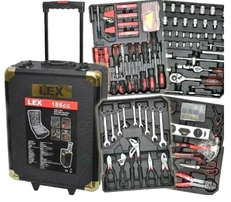 Набір інструменту в машину 186ед LEX (Польща), Набір інструменту для автомобіліста, NST Набір інструментів LEX складається з 186 единиц з робочими квадратами 1/2 і 1/4. Набір вкрай практичний і надійний в експлуатації. Насадки та інструменти виготовлені з високоміцної хромо-ванадіумної сталі, що забезпечує високі експлуатаційні характеристики, а також захист від корозії. Завдяки суворому дотриманню технології виробництва, весь інструмент характеризуються точністю й браком дефектів. Особливості: - Великий набір інструментів для дому або майстерні. - Усі інструменти набору виготовлені з хромо-ванадієвого сплаву. - Весь інструмент вирізняється високою точністю. - Антикорозійна обробка інструментів. - Валіза має колеса та телескопічну ручку. - Інструмент виготовлений із хромо-ванадієвої сталі. Комплектація Перший ящик: - ключі ріжково накидні з тріскачкою: 6; 8; 10; 11; 12; 13; 14; 15; 17 мм; - плоскогубці; - жабеня; - ключ шведський розвідний; - щипці; Другий ящик: - торцеві ключі + ручки та подовжувачі 1/4"; - подовжувач 1/4 (2 шт. -50 и 100 мм); - подовжувач 1/2 (1 шт. - 120 мм); - універсальний шарнір 1/4 і 1/2; - подовжувач гнучкий (гнучка) 150 мм; - регулятор Т; - трещотка 1/4 и 1/2; - ручка викрутки; - насадки 1/4 (4; 4,5; 5; 5,5; 6; 6,5; 7; 7,5; 8; 9; 10; 11; 12; 13; 14 мм.); - насадки 1/2 (7;8; 9; 10; 11; 12; 13; 14; 15; 16; 17; 18; 19; 20мм.); - наконечники свічок запалювання 16 мм і 21 мм; Третій ящик: - 3 шт. викрутки для високої напруги (1000): (-)4 по 100, 6x125, (+)4 по 100; - індикатор напруги (100 V — 500 V); - 6 шт. набір викруток прецизійних (zegarmistrzowskich) - шестигранні ключі: 1,5; 2; 2,5; 3; 4; 5; 6; 8; 10; - подовжувач магнітний; - 11 шт. викруток; Четвертий ящик: - вимірювання 5 м; - бульбашковий рівень; - щипці; - молоток; - ножиці; - ізоляційна стрічка; - ніж для шпалер; - електричний пістолет для клею + 2 картриджі для склеювання; - набір цвяхів і викруток; - універсальний прилад для електричних дротів;
