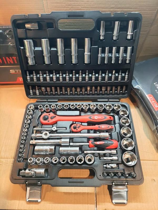 Набір ключів головок із тріскачкою 108ед, Набір ріжкових ключів для автомобіля, NST Професійний набір інструментів із дуже міцними головками та тріскачками. Головна особливість цього набору — це довговічність і стійкість, а підтвердженням тому є довічна гарантія на головки. Ідеально підходить для будь-яких складних технічних робіт. Набір на довгі роки виготовлений у Тайвань. Кейс із металевими замками. Високоякісний інструмент виготовлений із хром-ванадієвої сталі, найкращий у своєму сегменті. Надлегкі та зручні тріскачки на 72 зубці покриті поліпропіленом. Підійде абсолютно для кожного, чи то просто в господарстві, чи то на професійні станції техобслуговування та шиномонтаж. Комплектація * * * - Тріскачкова ручка 1/2" 72 зуби, реверсивна з двокомпонентним покриттям; - Головка шестигранная торцевая 1/2" 17 шт.: 10, 11, 12, 13, 14, 15, 16, 17, 18, 19, 20, 21, 22, 24, 27, 30, 32 мм; - Головка шестигранна подовжена 1/2" 5 шт.: 14, 15, 17, 19, 22 мм; - Головка торцевая TORX (звезда) 1/2" 8 шт.: Е10, Е11, Е12, Е14, Е16, Е18, Е20, Е24; - Подовжувач 1/2" 125 мм; - Вороток із плавальною головкою 1/2" 250 мм; - Головка свічкова 1/2" 2 шт.: 16 мм і 21 мм; - Кардан 1/2". - Перехідник 1/2" під біти; - Тримач 1/4" для головок і біт 150 мм. Біти: - HEX 5 шт.: 7, 8, 10, 12, 14 мм; - TORX 5 шт.: T40, T45, T50, T55, T60; - PH 2 шт.: PH3, PH4; - PZ 2 шт.: PZ3, PZ4; - SL 3 шт.: 8, 10, 12 мм. - Головка з насадкою HEX 1/4" 4 шт.: 3, 4, 5, 6 мм; - Головка с насадкой TORX 1/4" 7 шт.: T8, T10, T15, T20, T25, T27, T30; - Головка зі шліцьовою насадкою SL 1/4" 3 шт.: 4, 5.5, 6.5 мм; - Головка з насадкою PH 1/4" 2 шт.: PH1, PH2; - Головка з насадкою PZ 1/4" 2 шт.: PZ1, PZ2. - Тріскачкова ручка 1/4" 72 зуби, реверсійна з двокомпонентним покриттям; - Головка шестигранна торцева 1/4" 13 шт.: 4, 4.5, 5, 5.5, 6, 7, 8, 9, 10, 11, 12, 13, 14 мм; - Головка шестигранна подовжена 1/4" 8 шт.: 6, 7, 8, 9, 10, 11, 12, 13 мм; - Головка торцева TORX (зірка) 1/4" 5 шт.: Е4, Е5, Е6, Е7, Е8; - Подовжувач 1/4" 2 шт.: 50, 100 мм; - Вороток 1/4" з плавальною головкою 110 мм; - Кардан 1/4"; - Г-подібні шестигранні ключі 3 шт.: 1.5, 2, 2.5 мм.