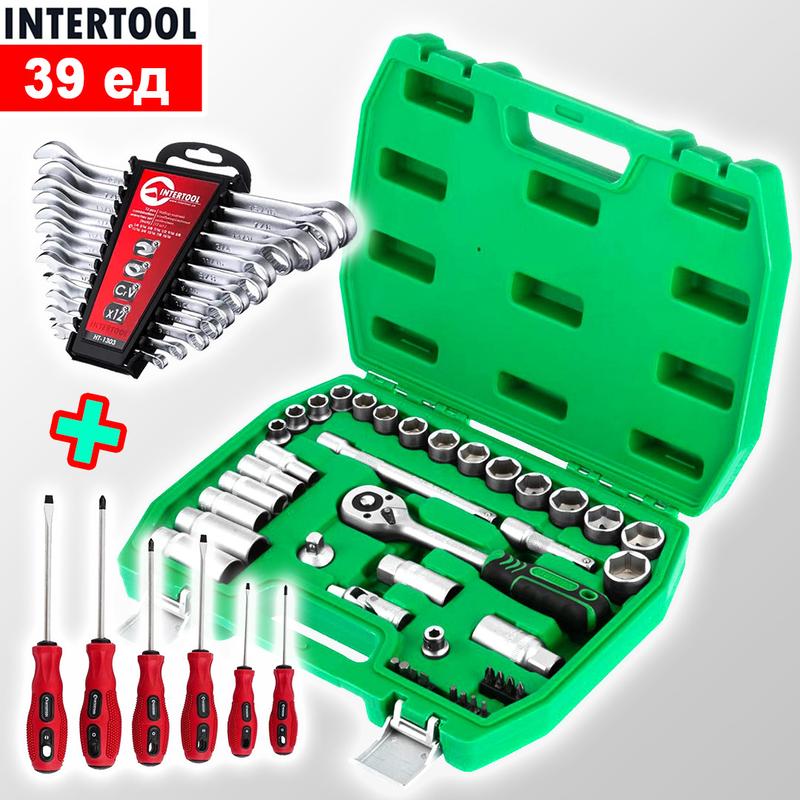 Комбинированный набор инструментов 39ед (3/8) + набор ключей 12шт + набор отверток 6шт, NST Комплект состоит из 3х элементов: - Набор инструментов INTERTOOL 39 ед. (3/8") - Набор ключей комбинированных INTERTOOL 12 шт. (6-22 мм), CrV - Набор отверток INTERTOOL 6 ед. (SL3*75, SL5*100, SL6*125, PH0*75, PH1*100, PH2*125), CrV Информация о наборе инструментов Набор с комплектацией в 39 единиц включает в себя трещотку, набор шестигранных головок от 8 до 22 мм, головки средней длины 8-19 мм, для работы с креплениями в труднодоступных местах. Свечные головки на 16 и 21 мм помогут извлечь свечи зажигания. Удлинители 75, 150 мм и наличие кардана намного упрощают работу с креплениями со сложным расположением в глубине деталей.Бети из разного типа (TORX, PZ, HEX, PH, SL) для бытовых работ также помогут при ремонте бортовой техники в авто. Комплектация: - Трещотка 3/8", 72 зуба, реверсионная; - Головка шестигранная 3/8", 14 ед.: 8, 9, 10, 11, 12, 13, 14, 15, 16, 17, 18, 19, 21, 22 мм; - Головка средней длины 3/8", 6 ед.: 8, 10, 12, 13, 17, 19 мм; - Головка свечная 3/8", 2 ед.: 16, 21 мм; - Удлинитель 3/8", 2 ед.: 75, 150 мм; - Кардан 3/8"; - Переходник 3/8"-1/2"; - Адаптер для бит 3/8". - Биты, 11 ед. - TORX 3 ед.: T10, T15, T20; - PZ 2 ед.: PZ1, PZ2; - HEX 2 ед.: 5, 6 мм; - PH 2 ед.: PH1, PH2; - SL 2 ед.: 4, 5.5 мм. Информация о наборе комбинированных ключей В набор вошли рожково-накидочные ключи, размерами: 6, 7, 8, 9, 10, 11, 12, 13, 14, 17, 19, 22 мм. Это позволяет выбрать необходимый размер под любые задачи по монтажу и демонтажу резьбовых соединений гаек и болтов. Ключи изготовлены из прочной Cr-V стали, не подверженной разрушению, имеют повышенный запас прочности и выдерживают большие нагрузки. Информация о наборе отверток - Длина отвертки: 75, 100, 125 мм. - Тип насадок: SL3, 5, 6 мм; PH0, PH1, PH2 - Количество в наборе 6 ед. - Тип: эргономичный - Вес 0,538 кг