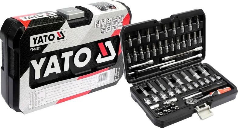 Набір інструментів 216 56ед YATO (Польща), Набір торцевих головок інтертул, NST Є універсальним набором із достатньою комплектацією, щоб забезпечити комплексну роботу з нарізними з'єднаннями, що мають внутрішній і зовнішній профіль. Цей набір позиціюється як професійний, він придатний для застосування, як у побуті та гаражному ремонті, так і в автосервісі або на виробництві. Добре підібрана збалансована комплектація, що містить три чотири різновиди торцевих головок, три ручні інструменти, а також допоміжний, що дає можливість працювати як зі стандартними, так і ускладненими нарізними з'єднаннями. Тріскачка з храповиком на 72 зуби є ідеальним рішенням для роботи з невисокими крутними моментами, її крок перемикання 5 градусів дає змогу відкрутити/закрутити нарізний елемент у обмеженому просторі, де залишається мінімум місця для маневру. Усі інструменти виготовлені з якісних матеріалів, серед яких хромо-ванадієва сталь (торцеві головки, ручний інструмент), хромо-молібденова сталь (приєднувальний квадрат воротка та тріскачки) і сталь S2 (вставки в торцевих головках). Набір постачається в ударостійкому пластиковому кейсі з прокладкою з піни, яка запобігає перемішуванню інструментів. Комплектація: - головки торцеві 6-г, довжина 25 мм — 4, 4.5, 5, 5.5, 6, 7, 8, 9, 10, 11, 12, 13 мм — - головки подовжені 6-г, довжина 50 мм — 6, 7, 8, 9, 10, 11, 12, 13 мм - головки із зіркуватим профілем — E4; E5; E6; E7; E8; E10 - подовжувачі 75 м 150 мм - переходник 1/4"(F) x 3/8"(M) - гнучкий подовжувач — 150 мм - трещотка на 72 зуба - викруткова ручка, 150 мм - Комір, що ковзає, Т-подібний - карданний шарнір - адаптер для біт Головки з насадками: - PH – PH1, PH2, PH3 - PZ – PZ1, PZ2, PZ3 - - SL — 4, 5.5, 6.5 мм - - Torx - T8, T10, T15, T20, T25, T30, T40 - - HEX - 1.5, 2, 2.5 мм