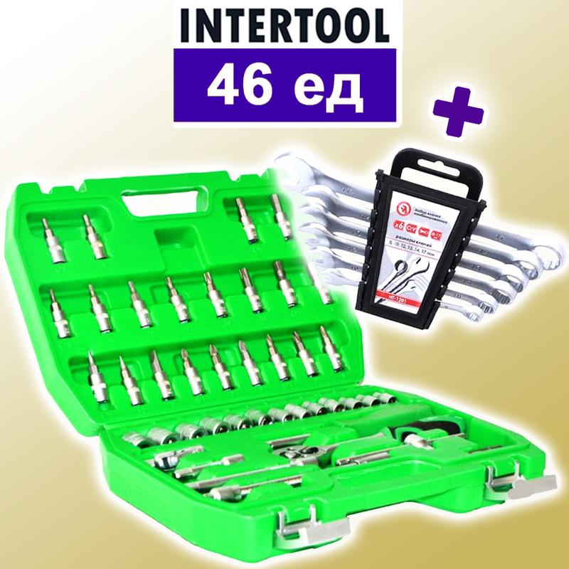Автомобільний набір ключів, Автомобільний набір інструменту 46ед (1/4) + набір ключів 6 шт., NST Комплект складається з: 1. Набір інструментів INTERTOOL 46 шт., 1/4" (Розмір головок 4-14 мм, Квадрат 1/4", Габаритні розміри 260х180х70 мм) 2. Набір комбінованих ключів INTERTOOL 6 од., 8-17 мм Cr-V (Розмірна лінійка набору — 8; 10; 12; 13; 14; 17 мм) Інформація про набір інструментів Набір інструментів складається з 46 одиниць із робочим квадратом 1/4". Оптимальний для виконання "дрібних" робіт по дому або ремонту автомобіля. Надежен и долговечен. Всі насадки виготовлені з високоміцної хромо-ванадієвої сталі, що забезпечує високі експлуатаційні характеристики, а також захист від корозії. Набір укомплектований у зручний пластиковий кейс. Наявність великого набору торцевих головок і викруткових біт робить набір придатним для широкого спектра робіт. Завдяки суворому дотриманню технології виробництва, весь інструмент характеризуються точністю й браком дефектів. Комплектація - Тріскачкова ручка 1/4", 72 зуби, реверсійна; - Головка шестигранна торцева 1/4", 13 шт.: 4, 4.5, 5, 5.5, 6, 7, 8, 9, 10, 11, 12, 13, 14 мм; - Подовжувач 1/4" 50, 100 мм; - Гнучкий подовжувач 150 мм; - Вороток 115 мм; - Кардан 1/4"; - Адаптер для шурупокрута 1/4"; - Тримач 1/4" для головок і біт 150 мм. Біти: - TORX 6 шт.: T10, T15, T20, T25, T30, Т40; - HEX 6 шт.: 3, 4, 5, 6, 7, 8 мм; - PH 3 шт.: PH1, PH2, PH3; - PZ 3 шт.: PZ1, PZ2, PZ3; - SL 3 шт.: SL4, SL5.5, SL7. Інформація про комбінованих ключів Набір із 6 комбінованих ключів, кожен із яких являє собою поєднання ріжкового та накидного гайкового ключа. Розмірна лінійка набору — 8; 10; 12; 13; 14; 17 мм. Обидві сторони ключів мають однаковий розмір головки. Ріжкова сторона ключів є найпопулярнішою серед з'єднань і має велику сферу застосування. Накидна сторона ключів завдяки кільцевій будові, у момент застосунка зусилля дає змогу розподілити навантаження рівномірно. Це знижує ризик «злизнути» гранню кута. Ключі виготовлені з хромо-ванадієвої сталі. Її фізичні та хімічні властивості зумовлюють високу стійкість до механічних навантажень, корозійну стійкість і твердість. Крім того, ця легована сталь має сприятливий модуль пружності. Зручна форма ключа забезпечує оптимальні умови для застосунка зусилля. Ключі постачаються в зручному пластиковому тримачі з ручкою й отвором для підвішування.