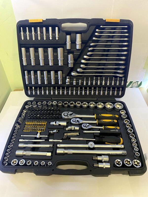 Набір ключів для авто у валізі, Набір ключів ріжкових накидних із тріскачкою 216ел Vorel (Польща), NST Комплектація - Головки торцевые 1/2": 10, 11, 12, 13, 14, 15, 17, 19, 20, 21, 22, 24, 27, 30, 32 мм. - Головки торцевые 3/8”: 10, 11, 12, 13, 14, 15, 16, 17, 18, 19 мм. - Головки торцевые 1/4”: 4, 4.5, 5, 5.5, 6, 7, 8, 9, 10, 11, 12, 13, 14 мм. - Головки торцеві 1/2”: E20, E22, E24. - Головки торцеві 3/8”: E10, E11, E12, E14, E16, E18. - Головки торцеві 1/4": E4, E5, E6, E7, E8. - Трещотка 45Т: 1/2", 3/8", 1/4". - Вороток Т-подібний: 1/2", 1/4". - Кардан: 1/2", 3/8", 1/4". - Подовжувачі 1/2”: 125 і 250 мм. - Подовжувачі 3/8”: 125 мм. - Подовжувачі 1/4": 50 і 100 мм. - Головки свічкові 1/2": 16 і 21 мм. - Головки свічкові 3/8": 18 мм - Ключі комбіновані: 8, 10, 11, 12, 13, 14, 15, 16, 17, 18, 19, 22 мм. - Ключі шестигранні: 1.27, 1.5, 2, 2.5, 3, 4, 5 мм. - Викрутка під біти 1/4". - Насадка для викрутки: 106 шт. Набір інструментів VOREL — це професійний ручний інструмент, необхідний для роботи вдома, на СТО (автомастерських, автосервісах) і на виробництві. Більшість інструментів зроблені з міцної хромо-ванадієвої сталі. Набір інструментів VOREL використовується під час виконання різних різновидів робіт. Для зручності використання інструменти зібрані в пластиковий кейс.