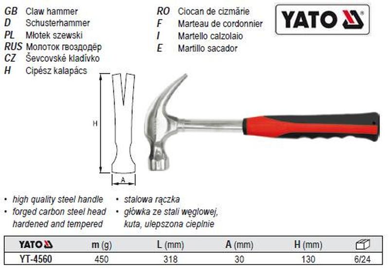 Молоток гвоздодер цвяховидирач металева ручка m=600 гр l=318 мм yato-4560