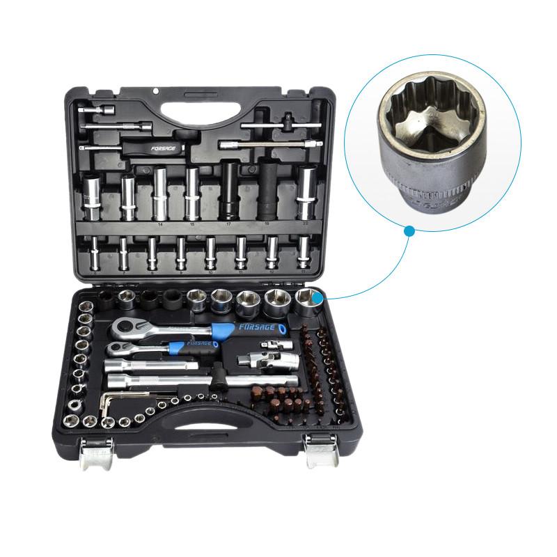 Набір інструментів F-4941-9 Premium, 1/2 та 1/4 дюйма, упакований у пластиковий кейс і складається з 94+6 предметів із сталі CrV-групи, призначених для монтажу та демонтажу різьбових кріплень з різними типами шліців. У комплект входять кардани, подовжувачі та перехідники, що полегшують роботу у важкодоступних місцях. Набір використовується для ремонту автомобілів, а також корисний у побуті. ПеревагиЕлементи набору стійкі до зношування і прослужать довго, оскільки виготовлені з високоміцної сталі хромованадієвої групи.Інструменти та насадки не схильні до корозії, т.к. їх захищає спеціальне матове покриття.Корпус кожного тріскачкового ключа стійкий до пошкоджень завдяки захисному покриттю.Тріскачки мають плавний хід.Ключі- тріскачки адаптовані для комфортної роботи однією рукою завдяки перемикачам із насічкою.Набір зручний у зберіганні та транспортуванні, т.к. упакований в ударостійкий пластиковий кейс із металевими замками. Склад:Посадковий квадрат: 1/2"; 1/4".Торцеві головки 1/2", довжина 38 мм: 8, 10, 12, 13, 14, 15, 16, 17, 18, 19, 21, 22, 23, 24, 27, 30, 32 мм.Торцеві головки 1/4", довжина 25 мм: 4, 5, 5.5, 6, 7, 8, 9, 10, 12, 13, 16".Глибокі торцеві головки 1/2", довжина 77 мм: 14, 15, 17, 19 мм.Глибокі торцеві головки 1/4", довжина 50 мм: 6, 7, 8, 9, 10, 11, 12, 13 мм.Головки свічкові - головки свічки 1/2": 16 мм і 20.6 мм.Біти 5/16", довжина 30 мм: Hex 8, 10, 12, 14 мм; Torx T40, T45, T50, T55; SL 8, 10, 12 мм; , PZ.6, Spline: М5, М6, М8, М10, М12, М14.Головки-біти 1/4" довжина 32 мм: Hex 3, 4, 5, 6 мм; Torx T8, T10, T15, T20, T25, T30, Т40; , PH.2;PZ PZ.1, PZ.4.Тріскачка 1/4"; тріскачка 1/2".Адаптер-перехідник 3/8"(F)х1/2"(M).Т-подібний комір з плаваючою головкою 1/4".Кардан 1/4"; кардан 1/2".Шестигранні Г-подібні ключі: 4, 5, 6 мм; Г-подібні ключі Torx з отвором: T20H, T25H.Викрутка-комір 1/4".Подовжувачі 1/4"50 мм. і 100 мм.; подовжувач гнучкий 1/4"; подовжувачі 1/2"125 мм та 250 мм.Утримувач біт 1/2"(F) x 5/16"(F).Упаковка (зберігання): кейс.