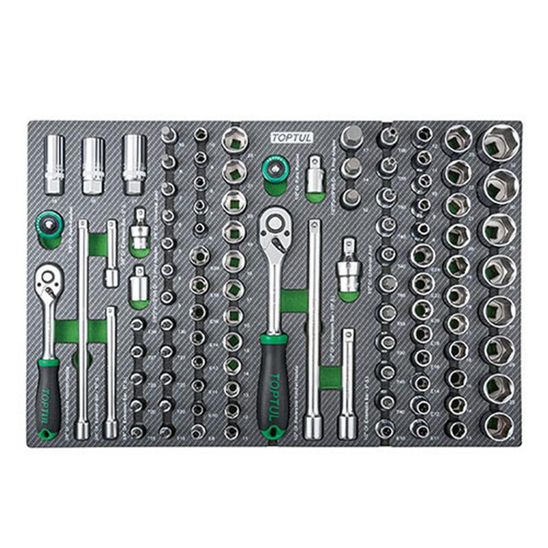 Набір інструменту в ложементі комбінований 3/8", 1/2" 104ед. (тип D) TOPTUL GEDA429 Набір інструментів у ложементі — це зручний і компактний набір інструментів, що постачається в спеціальному ложементі для зберігання й перенесення. Він стане в пригоді як професіоналам, так і домашнім майстрам, даючи змогу забезпечити необхідний інструмент для виконання різних робіт. Ложемент забезпечує зручне зберігання й організацію інструментів, що дає змогу легко знайти потрібний інструмент і уникнути його втрати. Кожен інструмент у наборі має відведене місце, що забезпечує лад і легкість доступу до них. Набір може містити різні інструменти, як-от гайковерти, ключі, викрутки, плоскогубці, різаки, вимірювальні інструменти та інше обладнання залежно від варіанту набору. Такий набір є ідеальним рішенням для ремонту, будівництва, автомобільного сервісу, технічного обслуговування та багатьох інших робіт. Він забезпечує зручний і швидкий доступ до інструментів, даючи змогу ефективно виконувати роботу й заощаджувати час і зусилля. Набір інструментів у ложементі є практичним і корисним подарунком для будь- якого майстра або людини, що працює ремонтом і будівельними роботами. Він допоможе забезпечити всі необхідні інструменти в одному місці, що робить його незамінним компаньйоном у різних сферах діяльності.