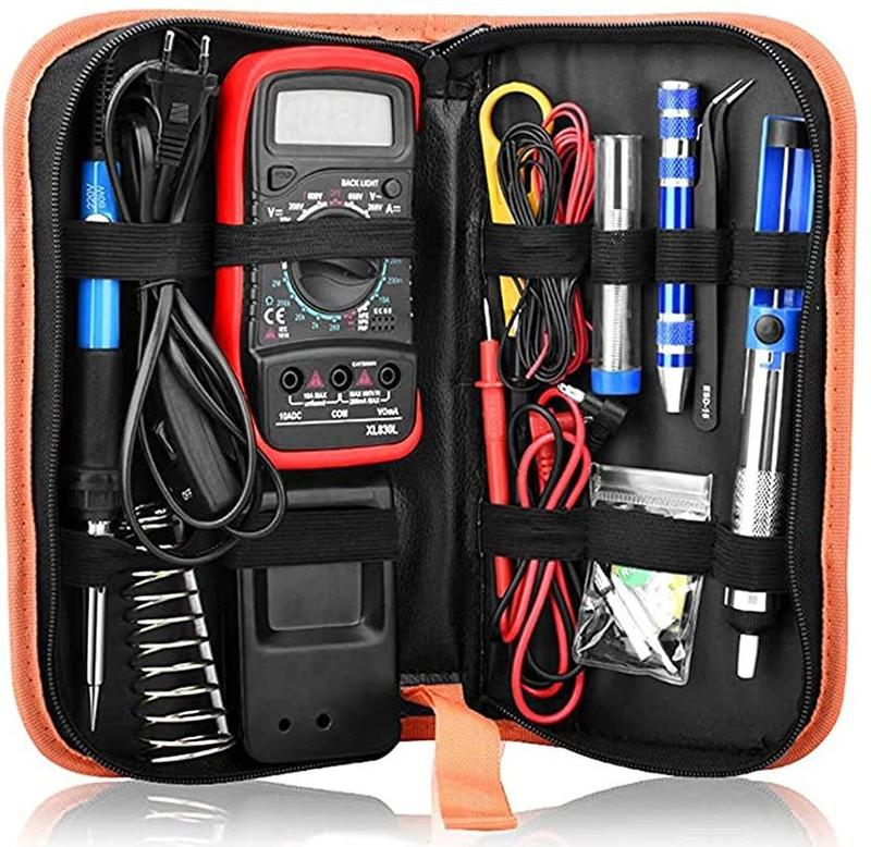 Набір інструментів для паяння з терморегулятором 60W 18 в 1. Паяльник 60 Вт до 450 C° Паяльник оснащений електронним термодатчиком, який вимірює температуру жала, вслід мікроконтролер дає імпульсну напругу для регулювання, тим самим, дозволяючи однаково якісно припаяти як мікро деталь, не перегрів її, так і велику металеву деталь, наприклад, електролітичний конденсатор. У звичайних дешевих паяльниках з регулятором температури, регулювання досягається зниженням напруги живлення до потрібного рівня. Сумка чохол має прямокутну форму та виконаний із міцної тканини. Для кожного елемента в сумці відведено окреме місце, що дозволяє всім інструментам розташовуватися окремо один від одного. Розташування окремо всіх додаткових елементів дозволяє не тільки утримувати все гаразд, а й уникнути плутанини в їхньому розташуванні. Даний набір буде зручний як початківцям та любителям дрібного паяння, так і професіоналам, які щільно займаються ремонтом дрібної побутової електроніки. Особливості - Зручний, переносний набір для паяння різної дрібної електроніки. - Наявність усіх необхідних допоміжних інструментів для полегшення роботи. - Наявність термодатчика в паяльнику для якіснішого паяння. - Паяльник із комплекту має регулятор температури від 180 °C до 480 °C. - У паяльнику використовується керамічне паяльне нагрівальне жало. - Зручна упаковка для перенесення та зберігання всіх інструментів. Характеристики - Потужність: 60 Вт. - Частота: 50-60 Гц. - Діапазон температури: 180-450 °С. - Стабільність температури: ±5°С. - Тип нагріву: керамічний елемент. - Жало паяльника: 900M - B1.2. - Довжина дроту: 1,4 метри з вимикачем. - Розмір паяльника: 242 х 25 х 25 мм. - Вага паяльника: 96 грам. - Матеріал упакування: щільна тканина. - Розмір упаковки: 265 х 155 х 50 мм. - вага упаковки: близько 700 грам. Комплектація - 1 шт - паяльник - 5 шт - тис (наконечників) для паяльника - 1 шт - підставка для паяльника - 1 шт - мультиметр XL830L з щупами - 1 шт - міні-інструмент для зачистки проводів - 1 шт - пінцет вигнутий ESD-15 - 2 шт - чорний провід 22 та червоний провід 22 AWG - 1 шт - трубка для паяння - 1 шт - олововідсмоктувач для паяння - 1 шт - сумка для перенесення - 1 шт - губка для чищення - 1 шт- багатофункціональна викрутка 8 в 1