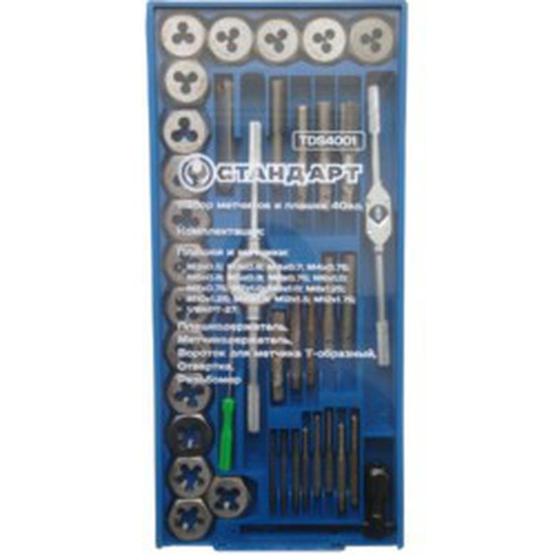 Набір плашок і позначників 40 од. СТАНДАРТ TDS4001 Кількість одиниць: 40 ед. Розміри: М3x**********.75,М5x0.8, М5x**********x0.75,М7x1.0,М8x1.0, М8x1.25,М10x1.25,М10x1.5,М12x1.5,М12x1.75 Вага: 0,7кг