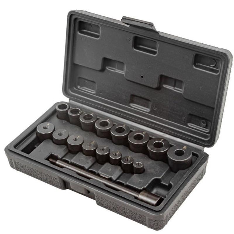 Набор для центровки сцепления от бренда Forsage F-917T2B. Детали сцепления, особенно ведомый диск, подвержены интенсивному износу, что требует периодической разборки всего этого агрегата и замены его компонентов. При сборке сцепления возникают некоторые сложности: ведомый диск до затяжки болтов корзины не имеет жесткого соединения с другими деталями, поэтому смещается относительно продольной оси всего узла, что затрудняет или делает невозможным его соединение с первичным валом КП. Во избежание этой проблемы перед сборкой сцепления необходимо отцентрировать ведомый диск, для выполнения данной операции используется специальное приспособление — набор для центровки сцепления. Он позволяет выполнить точную установку ведомого диска и облегчить его стыковку с первичным валом КП, при этом приспособление экономит силы и время. Однако положительного результата можно достичь только в том случае, если оправка точно подходит для ведомого диска и всего сцепления. Приспособление выполнено в виде стержня с резьбовым наконечником, на который устанавливается адаптеры. Для центровки приспособление с адаптером необходимого диаметра устанавливается в центральную втулку или в опорный подшипник в маховике, затем на стержень устанавливается и фиксируется кулачками ведомый диск сцепления. За счет равномерного выхода кулачков выполняется центрирование диска с маховиком, после чего можно устанавливать корзину сцепления. Данный набор упрощает работу за счет точного выравнивания дисков сцепления и пилотных подшипников. Набор- 8 конических центрирующих втулок для дисков сцепления с размерами отверстий: 14,5 - 25,5 мм- 8 адаптеров для центровки в коленчатом валу: 10,8 - 12,2 - 13,5 - 14,7 - 15,8 - 17,1 - 18,3 - 19,9 мм- Центрирующий вал 145 мм