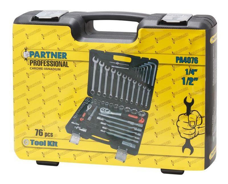 Представляем набор инструментов Partner PA-4076 — многофункциональный комплект ручного инструмента, состоящий из 76 предметов. Он станет незаменимым помощником в быту, в автосервисе или домашней мастерской, сочетая в себе качество, удобство и широкий выбор элементов для различных видов работ. Преимущества: 76 инструментов в одном кейсе: Этот набор включает все необходимое для ремонта автомобилей, разнообразной техники или выполнения бытовых задач. Посадочные квадраты 1/4" и 1/2": Наличие двух стандартных размеров позволяет работать с широким диапазоном крепежей, обеспечивая универсальность использования набора. Надежная сталь: Все инструменты изготовлены из прочных и долговечных материалов, что гарантирует их износостойкость и долгий срок службы. Удобное хранение: Набор поставляется в пластиковом кейсе с отделениями, который помогает поддерживать порядок, надежно фиксировать инструменты и быстро находить нужный элемент. Комплектация: Торцевые головки: 1/4" и 1/2" (различных размеров) Трещотки с быстрым сбросом: для легкой и оперативной смены насадок. Удлинители, карданные шарниры, воротки: для работы в труднодоступных местах и увеличения крутящего момента. Свечная головка: для обслуживания свечей зажигания. Комбинированные ключи: для универсального использования. Биты (Bit-насадки): Torx, Hex, Slotted (шлиц), PH (Phillips), PZ (Pozidriv) — широкий выбор для различных типов винтов. Г-образные шестигранные ключи: для работы с внутренними шестигранниками. Partner PA-4076 — это все, что нужно для качественного и надежного ремонта.
