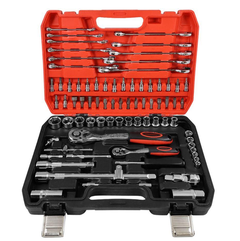Инструменты: 12 шт Торцевые головки 6-гранные: 8, 10, 12, 13, 14, 15, 16, 17, 18, 19, 22, 24 мм 1 шт Трещотка с быстрым сбросом 72Т 1 шт Удлинитель 15 мм шарнирный 18 шт Торцевая головка со вставкой: Т8, 10, 15, 20, 25, 30, 40; H3, 4, 5, 6; SL4, 5, 5.5, 6; PH1,2; PZ1, 2 15 шт Вставки-биты: SL8, 10, 12; T40, 45, 50, 55; H8, 10, 12, 14; PZ3, 4; PH3, 4 7 шт Торцевые головки 6-гранные: 7, 8, 9, 10, 11, 12, 13 мм 1 шт Кардан шарнирный 1 шт Трещотка с быстрым сбросом 72Т 1 шт Т-образный воротник 1 шт Удлинитель 51 мм шт Гибкий удлинитель 11 шт Комбинированный ключ: 8, 10, 11, 12, 13, 14, 15, 16, 17, 18, 19 мм 2 шт Торцевые головки свечные: 16, 21 мм 1 шт Отвертка-головодержатель 1 шт Хромованадиевая сталь.