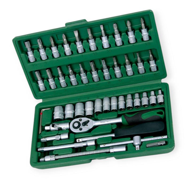 Набір інструменту 1/4" 46 шт, 4-14 мм з тріск., подовж., кардан, отв.-вороток, біти 600401...