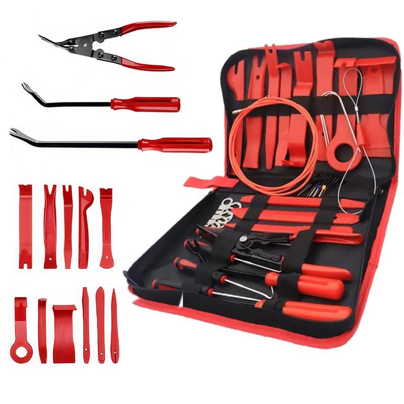Инструментарий для демонтажа автомобильной обшивки - это надежный и удобный комплект, который сэкономит ваши усилия и время в процессе проведения технического обслуживания и ремонта вашего автомобиля. Преимущества: - Высокая эффективность и простота в использовании. - Разнообразие инструментов. - Деликатный уход за салоном. - Гибкость использования. - Эргономичный дизайн. - Подходит как для профессионалов, так и для любителей. Описание: С помощью этого инструмента вы сможете аккуратно и быстро разобрать и демонтировать все нужные элементы интерьера автомобиля, не повредив обшивку и лакокрасочное покрытие. Эргономичные ручки, оптимальная толщина и длина инструментов, а также тщательная продуманность каждого компонента набора обеспечивают учет всех нюансов панелей, отверстий, соединителей и других деталей, что делает процесс демонтажа удобным и комфортным. Изготовлены из высококачественной нержавеющей и марганцевой стали, дополнены прочным и надежным POM-пластиком. Практичный кейс из прочной ткани Oxford с фиксирующими резинками надежно удерживает каждый инструмент на своих местах и обеспечивает удобную транспортировку, позволяя хранить его в ящике для инструментов, багажнике автомобиля или сумке для инструментов. Характеристики: - Тип товара: съемник обшивки салона / набор для разборки салона; - Материал инструмента: нейлон + металл + пластик; - Материал клипс: пластиковые; - Сумка-кейс: есть (из плотной ткани); - Количество инструментов: 40 шт; - Вес: 1,3 кг; Комплектация: - 12 инструментов для снятия обивки - Плоскогубцы - 2 съемника зажимов (22,5 и 31 см) - 8 радиоэкстракторов - 11 контактных ключей - 4 крючка для снятия уплотнителей - Система открывания дверей снаружи - Сумка-кейс - Упаковка