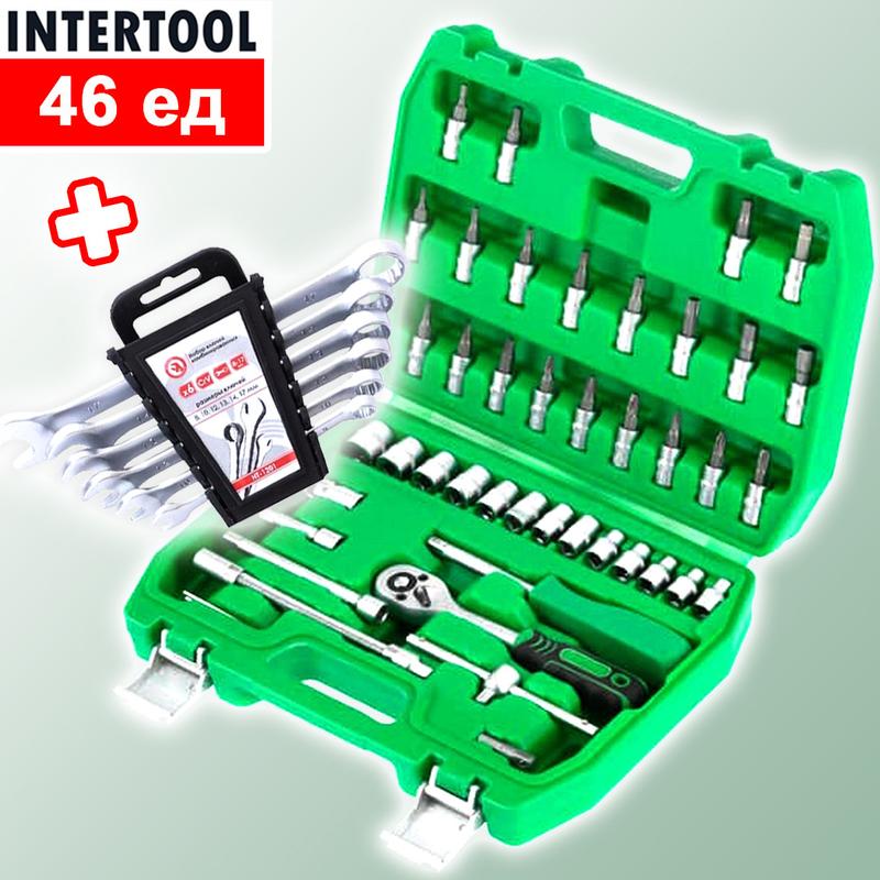 Гаражний інструмент для ремонту авто 46ед (1/4) + набір ключів 6 шт., NST Комплект складається з: 1. Набір інструментів INTERTOOL 46 шт., 1/4" (Розмір головок 4-14 мм, Квадрат 1/4", Габаритні розміри 260х180х70 мм) 2. Набір комбінованих ключів INTERTOOL 6 од., 8-17 мм Cr-V (Розмірна лінійка набору — 8; 10; 12; 13; 14; 17 мм) Інформація про набір інструментів Набір інструментів складається з 46 одиниць із робочим квадратом 1/4". Оптимальний для виконання "дрібних" робіт по дому або ремонту автомобіля. Надежен и долговечен. Всі насадки виготовлені з високоміцної хромо-ванадієвої сталі, що забезпечує високі експлуатаційні характеристики, а також захист від корозії. Набір укомплектований у зручний пластиковий кейс. Наявність великого набору торцевих головок і викруткових біт робить набір придатним для широкого спектра робіт. Завдяки суворому дотриманню технології виробництва, весь інструмент характеризуються точністю й браком дефектів. Комплектація - Тріскачкова ручка 1/4", 72 зуби, реверсійна; - Головка шестигранна торцева 1/4", 13 шт.: 4, 4.5, 5, 5.5, 6, 7, 8, 9, 10, 11, 12, 13, 14 мм; - Подовжувач 1/4" 50, 100 мм; - Гнучкий подовжувач 150 мм; - Вороток 115 мм; - Кардан 1/4"; - Адаптер для шурупокрута 1/4"; - Тримач 1/4" для головок і біт 150 мм. Біти: - TORX 6 шт.: T10, T15, T20, T25, T30, Т40; - HEX 6 шт.: 3, 4, 5, 6, 7, 8 мм; - PH 3 шт.: PH1, PH2, PH3; - PZ 3 шт.: PZ1, PZ2, PZ3; - SL 3 шт.: SL4, SL5.5, SL7. Інформація про комбінованих ключів Набір із 6 комбінованих ключів, кожен із яких являє собою поєднання ріжкового та накидного гайкового ключа. Розмірна лінійка набору — 8; 10; 12; 13; 14; 17 мм. Обидві сторони ключів мають однаковий розмір головки. Ріжкова сторона ключів є найпопулярнішою серед з'єднань і має велику сферу застосування. Накидна сторона ключів завдяки кільцевій будові, у момент застосунка зусилля дає змогу розподілити навантаження рівномірно. Це знижує ризик «злизнути» гранню кута. Ключі виготовлені з хромо-ванадієвої сталі. Її фізичні та хімічні властивості зумовлюють високу стійкість до механічних навантажень, корозійну стійкість і твердість. Крім того, ця легована сталь має сприятливий модуль пружності. Зручна форма ключа забезпечує оптимальні умови для застосунка зусилля. Ключі постачаються в зручному пластиковому тримачі з ручкою й отвором для підвішування.