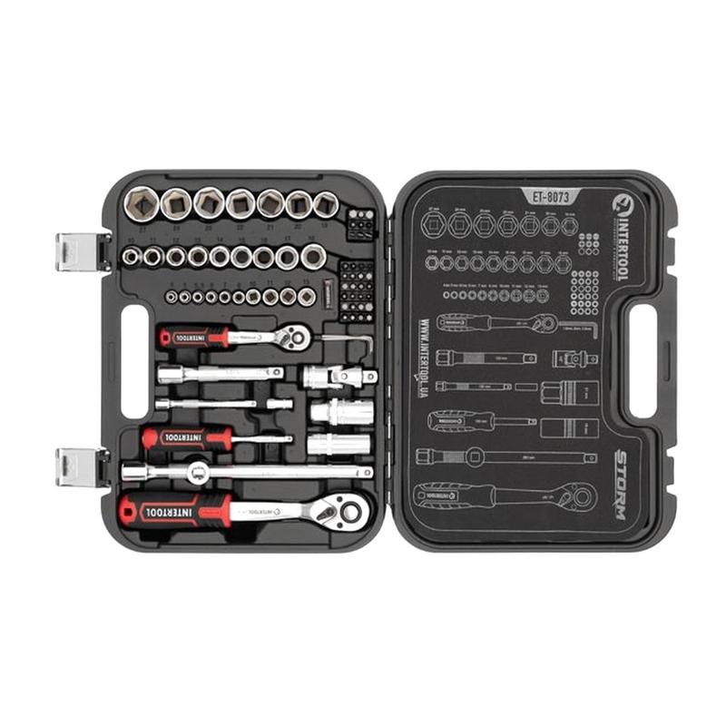 Набір інструментів для автомобіля та дому 73ед, Універсальний набір інструменту для автомобіля та дому, NST Набори інструментів INTERTOOL STORM — це нове слово на підтримку якості та багатофункціональності! Завдяки своїй практичності ідеально підходять для автолюбів і домашніх майстрів. Широкий вибір інструментів дає змогу впоратися майже з будь-яким типом кріплення, що дуже виручає під час раптових поломок у дорозі та під час ремонтних робіт у гаражі. Інструмент на будь-який випадок Головна особливість набору в його комплектації. Тут зібрані всі необхідні інструменти для заміни свічок запалювання, гальм і будь-якої іншої складної деталі автомобіля, розташованої в недоступних місцях. У комплекті вороток, подовжувачі, головки та кардан, потрібні для відкручування гайок, болтів і шпильок у глибоких колодязях двигунів або в місцях, де складно їх дістати. Дві головки для зняття свічок запалювання (21 і 16 мм) дають змогу замінити свічки на автомобілі будь-якого виробника, включно з країнами ЄС. Різноманітні біти (SL, PZ, PH, M, TORX, HEX) стануть у пригоді для роботи з різними типами шліців, які використовують у меблевій промисловості, будівництві, машинобудуванні та ін. Зручні та надійні тріскачки Усі комплектуючі механізми тріскачок на 72 зуби виготовлені на о. Тайвань. Вирізняються плавністю ходу та мають невеликий кут повернення — всього 50, завдяки чому працює швидко та точно. Вигнута форма тріскачки дає змогу дістати кріплення у важкодоступних місцях. Наявність реверсу та швидка зміна головок спростять роботу в безліч разів! Головки туго сидять на посадкових квадратах 1/2", 1/4" і не спадають. Насічки на кожній головці покращують зчеплення з долонею й не випадають із рук. Сама тріскачка зручно лежить у руці та має трикомпонентне гумове покриття. Довговічність і зносостійкість Головки та тріскачки набору виготовлені з флагманської та надійної сталі Cr-V 50BV30. Вирізняються винятковою міцністю і високим показником крутного моменту, стійкі до деформацій. Двошарове нікелеве покриття захищає від появи іржі, отже, інструмент слугує набагато довше за подібні аналоги! Біти виготовлені зі сталі Cr-V 6150, з чудовими параметрами твердості та пружності. Протиударний кейс Інструменти упаковані в надійний і ударостійкий пластиковий кейс. Для збереження й максимального терміну експлуатації інструмента, у валізі передбачені спеціальні відсіки з фіксатором для зберігання кожної деталі окремо. Металеві замки вбережуть кейс від випадкового відкриття. Ящик легко переносити та зберігати, він компактний і не займає багато місця (375*295*85 мм). Сучасний яскравий дизайн кейса точно не залишить нікого байдужим! Комплектація * * * Тріскачкова ручка 1/2", 72 зуби, реверсійна; Головка шестигранная торцевая 1/2", 16 шт.: 10, 11, 12, 13, 14, 15, 16, 17, 18, 19, 20, 21, 22, 23, 24, 27 мм; Головка свічкова 1/2", 2 шт.: 16, 21 мм; Подовжувач 1/2", 125 мм; Кардан 1/2"; Вороток із плавальною головкою 1/2" — 3/8", 250 мм. Тріскачкова ручка 1/4", 72 зуби, реверсійна; Головка шестигранна торцева 1/4", 10 шт.: 4, 5, 5.5, 6, 7, 8, 10, 11, 12, 13 мм; Подовжувач 1/4" 100 мм; Тримач 1/4" для головок і біт 150 мм; Перехідник для біт 1/4". Біти: TORX 8 шт.: T8, T10, T15, T20, T25, T27, T30, Т40; HEX 13 шт.: 3, 4, 5, 6, 8, 10, 1/8”, 9/64”, 5/32”, 3/16”, 7/32”, 1/4", 5/16”; PH 4 шт.: PH0, PH1, PH2, PH3; PZ 3 шт.: PZ1, PZ2, PZ3; SL 3 шт.: SL4, SL5.5, SL7; Spline 2 шт.: M6; М8. Набір Г-подібних шестигранних ключів, 3 шт.: 1.5 мм, 2 мм, 2.5 мм.