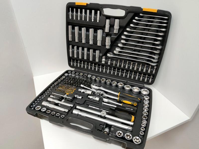 Великий набір інструментів у валізі 216ел Vorel (Польща), Великий набір інструментів для авто, NST Комплектація - Головки торцевые 1/2": 10, 11, 12, 13, 14, 15, 17, 19, 20, 21, 22, 24, 27, 30, 32 мм. - Головки торцевые 3/8”: 10, 11, 12, 13, 14, 15, 16, 17, 18, 19 мм. - Головки торцевые 1/4”: 4, 4.5, 5, 5.5, 6, 7, 8, 9, 10, 11, 12, 13, 14 мм. - Головки торцеві 1/2”: E20, E22, E24. - Головки торцеві 3/8”: E10, E11, E12, E14, E16, E18. - Головки торцеві 1/4": E4, E5, E6, E7, E8. - Трещотка 45Т: 1/2", 3/8", 1/4". - Вороток Т-подібний: 1/2", 1/4". - Кардан: 1/2", 3/8", 1/4". - Подовжувачі 1/2”: 125 і 250 мм. - Подовжувачі 3/8”: 125 мм. - Подовжувачі 1/4": 50 і 100 мм. - Головки свічкові 1/2": 16 і 21 мм. - Головки свічкові 3/8": 18 мм - Ключі комбіновані: 8, 10, 11, 12, 13, 14, 15, 16, 17, 18, 19, 22 мм. - Ключі шестигранні: 1.27, 1.5, 2, 2.5, 3, 4, 5 мм. - Викрутка під біти 1/4". - Насадка для викрутки: 106 шт. Набір інструментів VOREL — це професійний ручний інструмент, необхідний для роботи вдома, на СТО (автомастерських, автосервісах) і на виробництві. Більшість інструментів зроблені з міцної хромо-ванадієвої сталі. Набір інструментів VOREL використовується під час виконання різних різновидів робіт. Для зручності використання інструменти зібрані в пластиковий кейс.