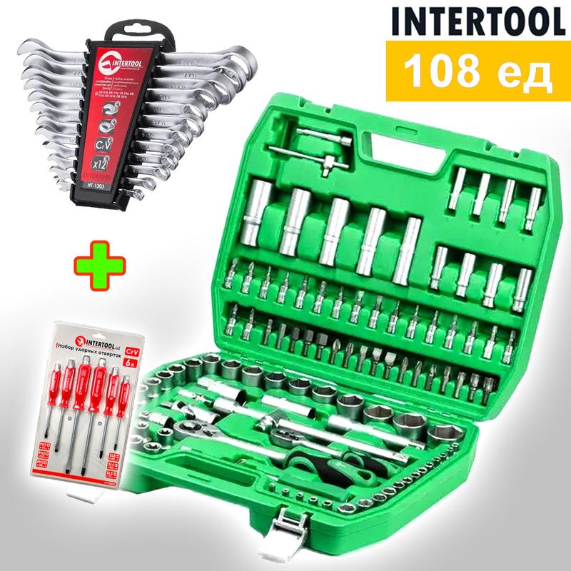 Ключи головки набор, Набор инструментов автомобильный 108ед + 12шт ключей + 6шт ударных отверток, NST Комплект состоит из 3 позиций: 1. Набор инструментов INTERTOOL 108 ед. (1/2" и 1/4") 2. Набор ключей комбинированных INTERTOOL 12 шт., 6-22 мм CRV 3. Набор ударных отверток INTERTOOL 6 ед. Информация о наборе инструментов Набор включает 108 элементов для решения любой задачи на откручивание, закручивание креплений. Разнообразие торцевых головок в наборе позволяет выполнять подавляющее большинство задач по ремонту автомобиля, а также техники. В комплектацию вошли торцевые шестигранные головки от 4 до 32 мм, позволяющие откручивать крепления разных диаметров. Высокие головки и воротники нужны для откручивания гаек, болтов и шпилек в глубоких колодцах двигателей или в местах, где сложно их достать. В этот набор также добавлены головки Е профиля (TORX, «звездочки»), для того чтобы вы смогли работать с элементами ходовой и двигателя, а также с узкоспециализированными креплениями. Наличие свечных головок на 16 и 21 мм позволяет выкрутить зажигательную свечу в любой машине, а благодаря удлинителям и карданам это можно сделать даже в глубоких колодцах двигателей. Кроме этого в ассортимент набора вошли различные биты, которые пригодятся при ремонте бортовой техники, электроники, мебели и т.д. Комплектация - Трещотка 1/2" 72 зуба, реверсионная; - головка шестигранная торцевая 1/2" 17 ед.: 10, 11, 12, 13, 14, 15, 16, 17, 18, 19, 20, 21, 22, 24, 27, 30, 32 мм; - головка шестигранная продлена 1/2" 5 ед.: 14, 15, 17, 19, 22 мм; - головка торцевая TORX (звезда) 1/2" 8 ед.: Е10, Е11, Е12, Е14, Е16, Е18, Е20, Е24; - удлинитель 1/2" 125 мм; - ворот с плавающей головкой 1/2" 250 мм; - головка свечная 1/2" 2 ед.: 16 мм и 21 мм; - Кардан 1/2". - переходник 1/2" для бит; - Держатель 1/4" для головок и бит 150 мм. Бити: - HEX 5 ед.: 7, 8, 10, 12, 14 мм; - TORX 5 ед.: T40, T45, T50, T55, T60; - PH 2 ед.: PH3, PH4; - PZ 2 ед.: PZ3, PZ4; - SL 3 ед.: 8, 10, 12 мм. - головка с насадкой HEX 1/4" 4 ед.: 3, 4, 5, 6 мм; - головка с насадкой TORX 1/4" 7 ед.: T8, T10, T15, T20, T25, T27, T30; - головка с насадкой SL 1/4" 3 ед.: 4, 5.5, 6.5 мм; - головка с насадкой PH 1/4" 2 ед.: PH1, PH2; - головка с насадкой PZ 1/4" 2 ед.: PZ1, PZ2. - Трещотка 1/4" 72 зуба, реверсионная; - головка шестигранная торцевая 1/4" 13 ед.: 4, 4.5, 5, 5.5, 6, 7, 8, 9, 10, 11, 12, 13, 14 мм; - шестигранная головка продлена 1/4" 8 ед.: 6, 7, 8, 9, 10, 11, 12, 13 мм; - головка торцевая TORX (звезда) 1/4" 5 ед.: Е4, Е5, Е6, Е7, Е8; - удлинитель 1/4" 2 ед.: 50, 100 мм; - ворот 1/4" с плавающей головкой 110 мм; - кардан 1/4"; - Г-образные шестигранные ключи 3 ед.: 1.5, 2, 2.5 мм. Информация о комбинированных ключей 12 шт. В наборе рожково-кидочные ключи, размерами: 6, 7, 8, 9, 10, 11, 12, 13, 14, 17, 19, 22 мм. Это позволяет выбрать требуемый размер под любые задачи для монтажа и демонтажа резьбовых соединений гаек и болтов. Ключи изготовлены из прочной Cr-V стали, не подверженной разрушению, имеют повышенный запас прочности и выдерживают большие нагрузки. Информация о наборе ударных отверток 6 ед Набор используется для откручивания ржавых и прикипелых винтов и саморезов. Этот тип отверток в большинстве своем предназначен для бытового использования, хотя и в других производственных отраслях эти отвертки себе зарекомендовали положительным образом. Отверточные хвостовики изготовлены из хром-ванадиевой стали, которая обеспечивает высокие эксплуатационные показатели и защиту от коррозии. В наборе 6 отверток с насадками SL5, SL6, SL8; PH1, PH2, PH3. Особенности - Отверточные хвостовики сделаны из хром-ванадиевой стали, что делает инструмент прочным и надежным, с антикоррози