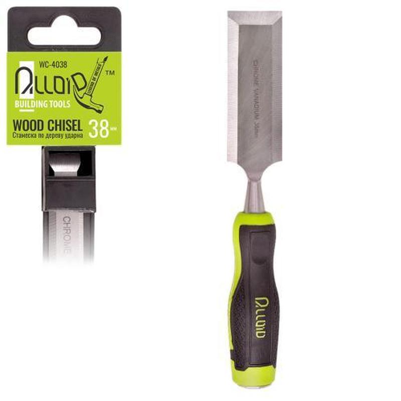 Стамеска по дереву ударна 38мм (WC-4038) Alloid Стамеска Alloid по дереву ударна з обрезиненной ручкою використовується для вибірки гнізд і пазів, вирізання отворів в деревині твердих і м'яких порід з використанням молотка або киянки. Чудове рішення як для професійних столярних майстерень, так і для домашніх майстрів. Переваги: - Інструмент виготовлений з високоякісної хромованадіевой стали, посилена і ударостійка, що гарантує високий комфорт роботи; - Двокомпонентна ударна рукоятка ергономічної форми забезпечує зручне захоплення, виключає прослизання інструменту в руці; - Стамеска Alloid фіксується на спеціальному підвісі укомплектований знімним захисним ковпачком для зручного зберігання стамески Alloid та захисту майстра від травм