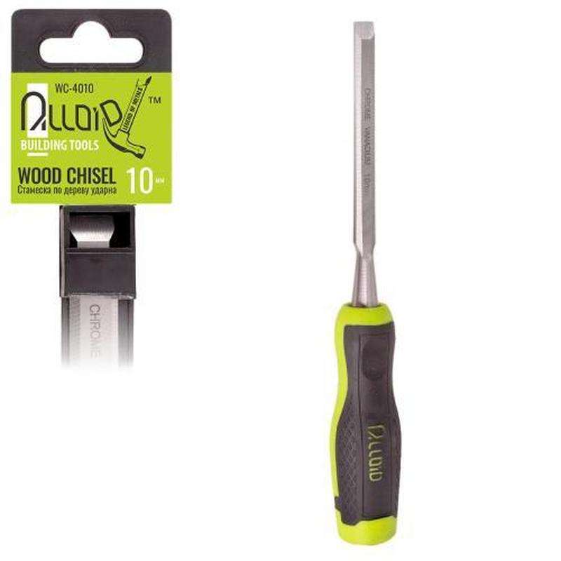 Alloid. Стамеска по дереву ударная 10мм (WC-4010) Стамеска Alloid по дереву ударная с обрезиненной ручкой используется для выборки гнезд и пазов, вырезания отверстий в древесине твердых и мягких пород с использованием молотка или киевлянки. Прекрасное решение как для профессиональных столярных мастерских, так и для домашних мастеров. Преимущества: - Инструмент изготовлен из высококачественной хромованадиевой стали, усилена и ударопрочна, что гарантирует высокий комфорт работы, - Двухкомпонентная ударная рукоятка эргономичной формы обеспечивает удобный захват, исключает проскальзывание инструмента в руке, - Стамеска Alloid фиксируется на специальном подвесе, укомплектованном съемным защитным колпачком для удобного хранения стамески Alloid и защиты мастера от травм.