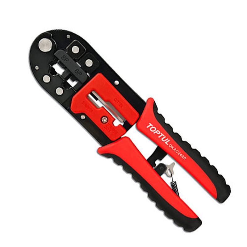 Кліщі для обтискача (RJ11/RJ12/RJ45) та зняття ізоляції трещоточные TOPTUL DKAC2420 Кліщі для обтискача (RJ11/RJ12/RJ45) та зняття ізоляції трещоточные TOPTUL DKAC2420 - професійний модульний обжимний інструмент з функціями відрізання і зачистки кабелю. Підходить для обтиску 6-позиційних роз'ємів RJ-11 / RJ-12 і 8-контактних роз'ємів RJ-45. Особливості: Замок з храповим механізмом Захисний кожух PP + TPR зручні пластикові ручки