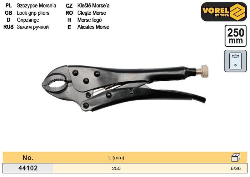 Клещи Морзе VOREL-44102 длиной 250 мм производства Vorel. Щипцы с защелкой позволяют быстро зафиксировать губки на материале. Чрезвычайно полезен при сварке, клепке или сверлении. Освобождение зажима с помощью специального рычага. Поверхность плоскогубцев чернение. - применение сварка - размер 10" - длина 250 мм - чистота поверхности порошковое покрытие