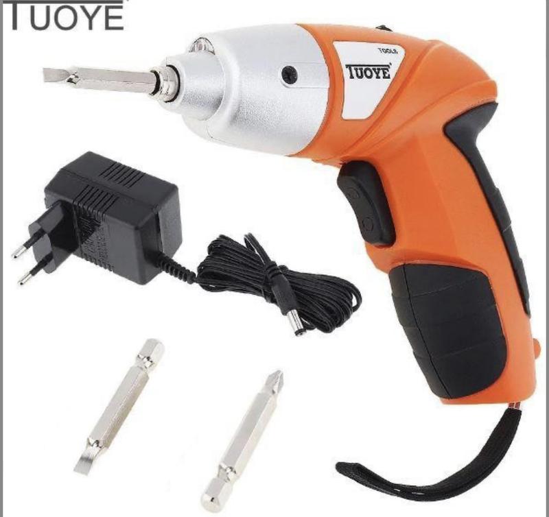 Шуруповерт викрутка Електрична PRO TUOYE з бітами та адаптером, електро шуруповерт, компактний легкий На відміну від мережевого інструменту, працювати цим шуруповертом можна там, де немає можливості протягнути кабель. Цей шуруповерт підійде для дому, для невеликих робіт, збирання меблів, закручування шурупів, свердління дерева, пластику. Для найбільшої зручності у комплекті з інструментом постачаються 4 насадки. Характеристики: У наборі 2 насадки. Індикатор заряджання. Надкомпактний розмір. Ергономічна рукоятка. Простота використання. Зручна пластикова валізка для зберігання та перенесення. Тип батареї: NiCd. Час заряджання – 5 годин. Швидкість холостого ходу: 0-150 об/хв. Комплектація: шуруповерт; адаптер; біти – 2 шт.; інструкція; коробка;