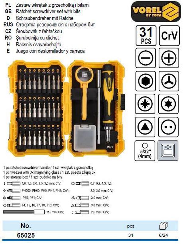Набір викрутка тріскачка насадки ø=5/32" crv лупа 31 штука vorel-65025