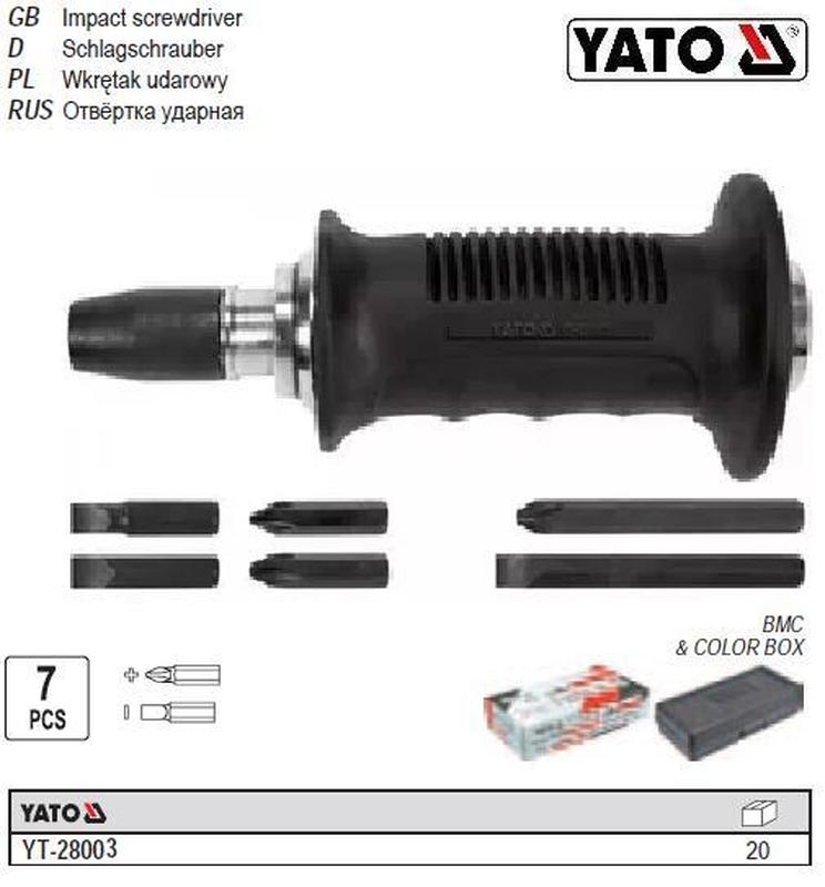 YATO-28003 - набір професійних ударних викруток для робіт в різних галузях промисловості. Кількість в наборі - 7 предметів. Стрижень виготовлений з удаопрочной стали. Рукоятка виготовлена з відповідно підібраних матеріалів підвищеної твердості. Міцність, досконалість виконання, виняткова надійність, відмінні матеріали, сталь високої якості і технічні особливості продукції YATO дозволяють з успіхом використовувати її у багатьох галузях промисловості, у сфері обслуговування, будівництві та домашньому господарстві.