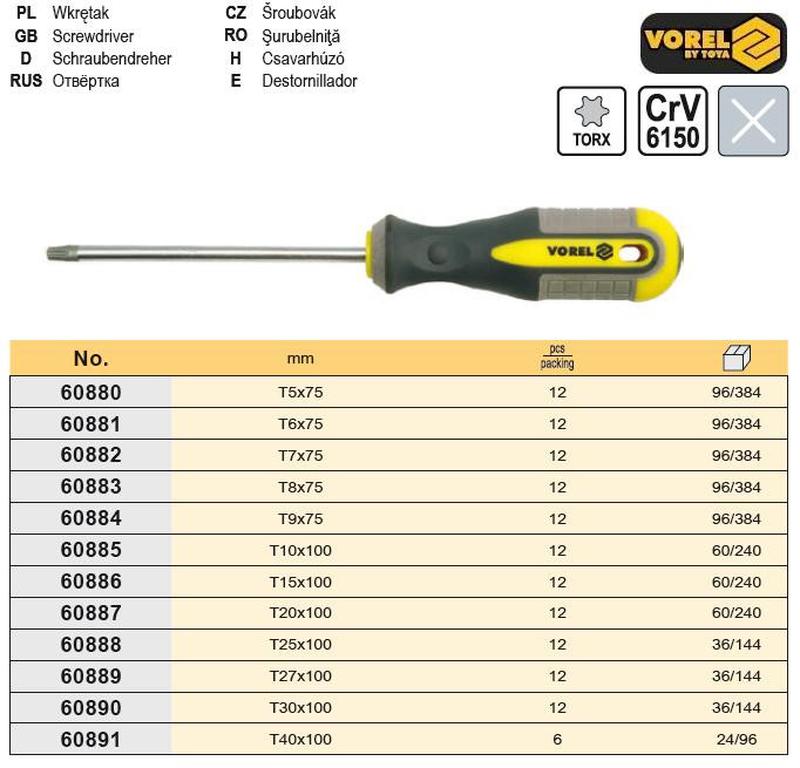 Торгова марка VOREL (Польща) є найбільшою частиною торговельної корпорації TOYA S.A. Цей підрозділ включає в себе ручні та пневмоінструменти для майстерень і домашнього користування. Відмінною особливістю бренду інструментів VOREL є хороша ціна і широкий асортимент. VOREL - це більше 4000 найменувань інструменту, які допомагають у роботі в майстеренях та домашньому господарстві.