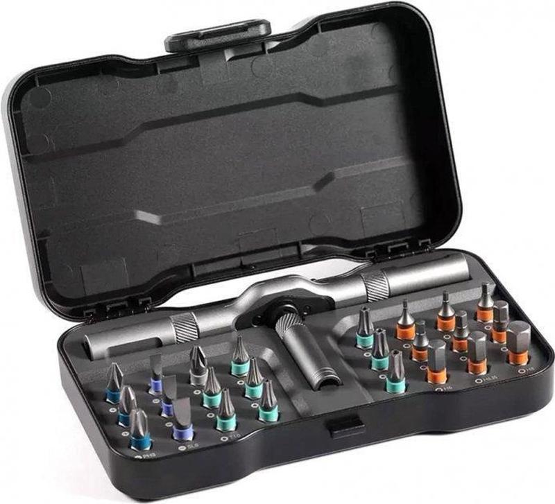 Характеристики: -марка DUKA -модельRS1 -Найменування товару Набір універсальних тріскачок AtuMan Duka RS1 -Кількість головок викруток 24шт, 5 категорій викруток -матеріал ручки Кований алюмінієвий сплав 6063 (корпус ручки) + легована сталь 5030 (шестірня і т. д.) -Матеріал головок викруток S2 хром молібденова легована сталь -Матеріал корпусу ABS + PP У комплекті постачання йдуть 24 сталеві біти: • Біти під прямий шліц: SL4, SL5, SL6. • Біти під шліць Phillips: PH1, PH2, PH3. • Біти під шліць Pozidriv: PZ2. • Біти під шліц Torx: T5, T6, T8, T10, T15, T20, T25, T27. • Біти під шліц шестигранник: 1.5 мм, 2 мм, 2.5 мм, 3 мм, 4 мм, 5 мм, 6 мм, 3.35 мм, 8 мм.