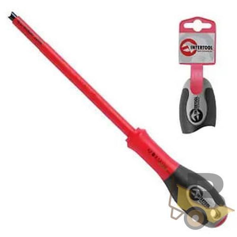 Електроізольована викрутка INTERTOOL призначена для безпечної та зручної роботи з електромережами, запобіжниками, перемикачами та різними приладами, під напругою до 1000 В. Ручка викрутки має високу ергономіку, зручно лежить у руці та не натирає мозолі. Прогумовані вставки запобігають вислизанню з рук, а тверда пластикова основа дозволяє швидко перехопити викрутку та докладати необхідне зусилля на відкручування або закручування кріплення. Робочий наконечник завужений для доступу до важкодоступних гвинтів.