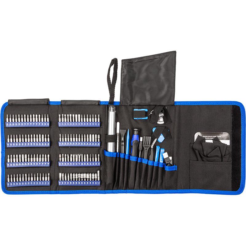 Набір магнітних прецизійних викруток з електричною викруткою, 144 предмети, у зручному футлярі з аксесуарами Характеристики: Це універсальний набір викруток, що складається з професійного набору прецизійних біт зі 120 предметів з ручкою електричної викрутки, що заряджається через порт USB Type-C, а також ручки викрутки з регульованою довжиною та інших інструментів для ремонту електроніки, все в портативному, міцному тканинному футлярі. Біти широко сумісні з більшістю побутових пристроїв, таких як мобільні телефони, окуляри, планшети, цифрові камери, годинники, комп'ютери, ноутбуки, контролери Xbox, Nintendo тощо. Ручка електричної викрутки має порт зарядки USB Type-C та вбудований літій- іонний акумулятор ємністю 350 мАг, що забезпечує до 90 хвилин роботи. Три вбудовані світлодіодні індикатори забезпечують комфортну роботу в умовах низької освітленості. Швидкість обертання (200 об/хв / 100 об/хв) можна перемикати тривалим натисканням кнопки світлодіода; вища швидкість встановлена ??за замовчуванням. Електричне регулювання крутного моменту від 0,12 до 0,35 Н·м дозволяє точно контролювати силу обертання викрутки для делікатної роботи, захищаючи гвинти від надмірного затягування та пошкодження. Також у комплект входить ергономічна ручка викрутки з регульованою довжиною та нековзним покриттям для надійного захоплення та комфортного використання. Біти магнітні, що забезпечує міцне утримання гвинтів та допомагає під час їх видалення. Маркування розмірів дозволяє швидко знайти потрібну біт, а набір містить запасні частини для найчастіше використовуваних біт. Біти викрутки виготовлені з хром-ванадієвої сталі, що забезпечує легкість використання та довговічність. Набір також містить додаткові інструменти для виконання широкого спектру ремонтних завдань. У комплект входить зручна магнітна накладка розміром 145x85 мм для упорядкування гвинтів під час розбирання. Комплект включає: біти для викрутки, ручку електричної викрутки в пластиковому футлярі, зарядний кабель, регульовану ручку викрутки, чорний портативний тканинний чохол для інструментів, вигнутий пінцет, 4 пластикові лопатки, 1 металеву лопатку, щітку для чищення, 8 пластикових трикутних лопатей (для розділення деталей пристрою без подряпин), гнучкий подовжувач викрутки 127 мм, гумову присоску з кільцем (для зняття екрана), штифт для вилучення SIM-картки, інструмент для намагнічування/розмагнічування, тканину для чищення та магнітну накладку для гвинтів. Примітка: Зарядний адаптер продається окремо. У комплект входить 30-сантиметровий зарядний кабель USB Type-A - USB Type-C. Технічні характеристики: Кількість біт: 120. Матеріал: хромована вандійова сталь CR-V. Довжина ручки викрутки: (регульована) 142~213 мм; (електрична) 177 мм. Довжина біт: 28 мм. Крутний момент: 0,12~0,35 Н·м. Ємність акумулятора: 350 мАг. Тип акумулятора: літій-іонний, 10440. Порт заряджання: USB Type-C. Напруга/струм заряджання: 4,5 В–6,5 В / 0,35 А. Максимальна швидкість (без навантаження): 200 об/хв (споживання 100 мАг). Максимальна швидкість (невелике навантаження): 150 об/хв (споживання 150–300 мАг). Час заряджання: >60 хв (червоний індикатор). Термін служби акумулятора: 90 хв роботи, 90 днів у режимі очікування. Розміри корпусу: 245x150x50 мм. Колір корпусу інструменту: чорний, синій. Типи біт: Phillips: (2x) PH0000, PH000, PH00, PH0, PH1, PH2. Flathead: (2x) 1.**********.0, 3.5, 4.0. Torx: (2x) T1, T2, T3, T4; (1x) T5, T6, T7, T8, T9, T10, T15, T20. Security T
