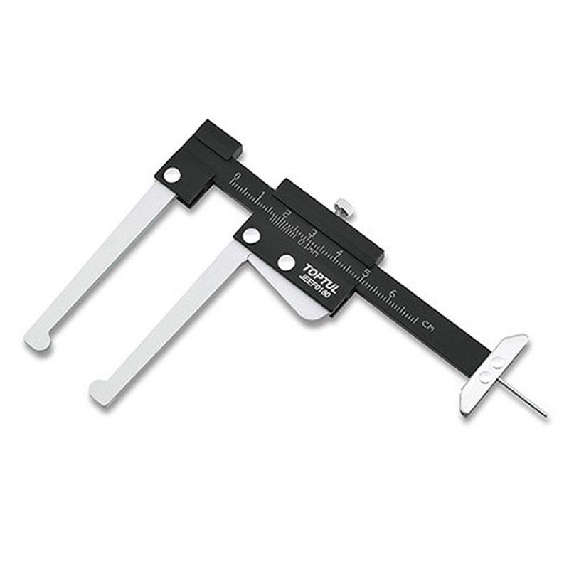 Штангенциркуль для дисків та шин TOPTUL JEEF0160 Штангенциркуль для гальмівних дисків та глибини протектора шин TOPTUL JEEF0160. Підходить для вимірювання товщини гальмівного диска і глибини шини. Затискний гвинт для полегшення зчитування показань. Спеціальний механізм розблокування губок дозволяє утримувати свідчення гальмівного диска, не послаблюючи затискний гвинт. Компактний розмір забезпечує доступ в обмеженому просторі. Метрична шкала з поділками 0,1 мм. Виготовлений з алюмінію. Діапазон вимірювання: 0-60 мм