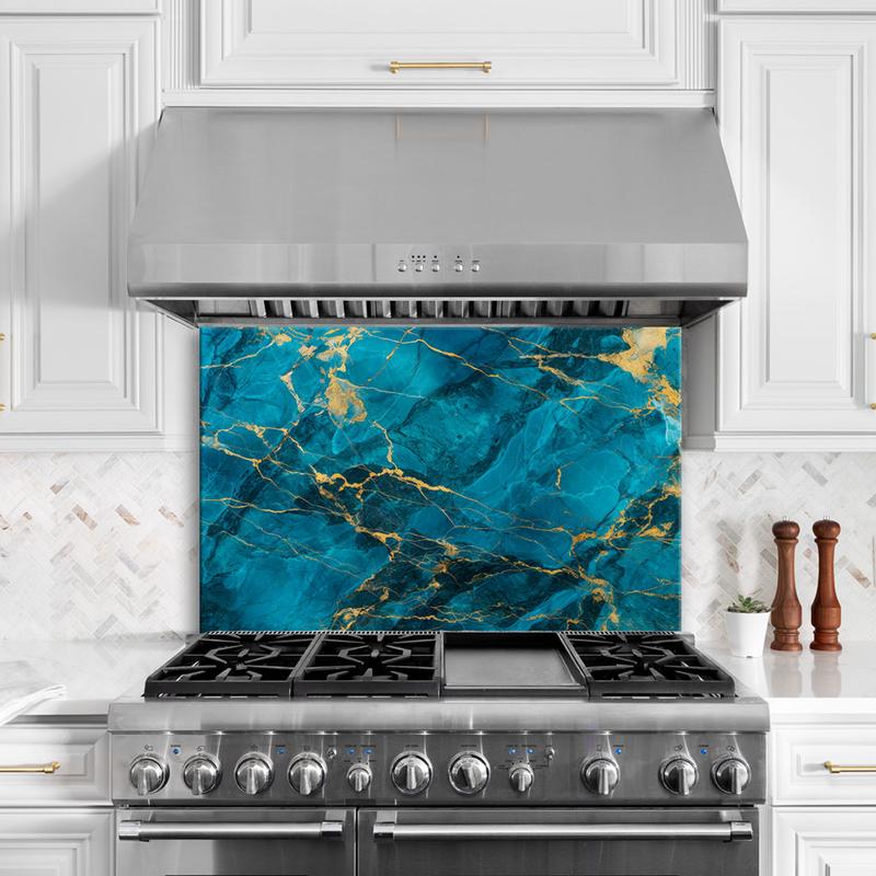 Cкляна панель для кухні "золото у синяві" 60х40см