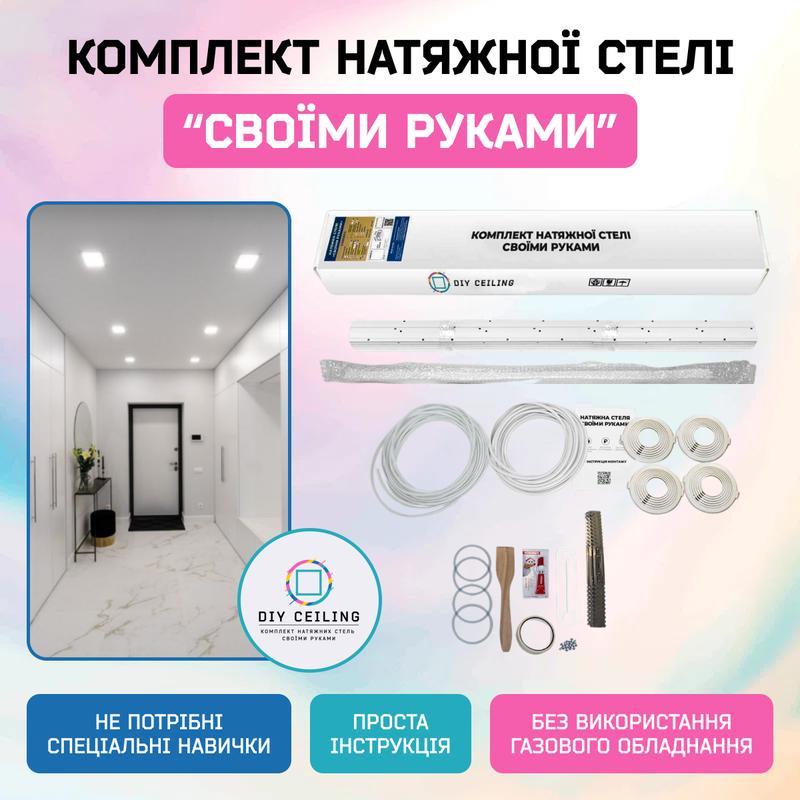 Натяжна стеля "Своїми руками"- це можливість самостійно створити простір своєї мрії. Тепер Ви можете легко та креативно створити елегантну та стильну натяжну стелю без допомоги фахівців та з економією до 75 %! Переваги: - Економія до 75% коштів на монтажних роботах; - Простий монтаж, який не вимагає спеціальних навичок; - Монтаж без використання спеціальної теплової пушки. Набір містить: - біле матове полотно, - профіль ПВХ, - гарпун, - декоративну вставку на профіль, - закладну платформу для люстри, - 4 закладні платформи для точкових світильників 55-110 мм, - термокільце для люстри, - 4 термокільця 75мм, - підвіси, - саморізи, - універсальний обвід для труби, - малярний скотч, - суперклей, - шпатель, - інструкцію для легкого монтажу. Інструкція крок-за-кроком допоможе Вам з легкістю оволодіти процесом, навіть якщо Ви новачок у ремонтних справах. Монтаж натяжної стелі дуже простий та займає лиш кілька годин. Не потрібне професійне теплове обладнання, достатньо мати звичайний фен - для розпрасування складок. 1) Виміряйте розміри кімнати, де бажаєте встановити стелю; 2) Додайте до кожного розміру 20 см; 3) На сайті оберіть комплект, який підходить Вам найкраще. Важливо, щоб запас полотна становив щонайменше 20 см до ширини та довжини кімнати, хоча він може бути і більшим; в телефонній розмові з менеджером при потребі змініть комплектацію під свої потреби) Дозвольте собі зекономити до 75 % коштів на монтажі без економії на якості!