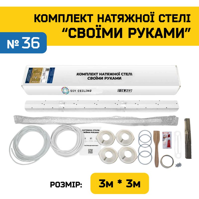 Натяжна стеля "Своїми руками"- це можливість самостійно створити простір своєї мрії. Тепер Ви можете легко та креативно створити елегантну та стильну натяжну стелю без допомоги фахівців та з економією до 75 %! Переваги: - Економія до 75% коштів на монтажних роботах; - Простий монтаж, який не вимагає спеціальних навичок; - Монтаж без використання спеціальної теплової пушки. Набір містить: - біле матове полотно, - профіль ПВХ, - гарпун, - декоративну вставку на профіль, - закладну платформу для люстри, - 4 закладні платформи для точкових світильників 55-110 мм, - термокільце для люстри, - 4 термокільця 75мм, - підвіси, - саморізи, - універсальний обвід для труби, - малярний скотч, - суперклей, - шпатель, - інструкцію для легкого монтажу. Інструкція крок-за-кроком допоможе Вам з легкістю оволодіти процесом, навіть якщо Ви новачок у ремонтних справах. Монтаж натяжної стелі дуже простий та займає лиш кілька годин. Не потрібне професійне теплове обладнання, достатньо мати звичайний фен - для розпрасування складок. 1) Виміряйте розміри кімнати, де бажаєте встановити стелю; 2) Додайте до кожного розміру 20 см; 3) На сайті оберіть комплект, який підходить Вам найкраще. Важливо, щоб запас полотна становив щонайменше 20 см до ширини та довжини кімнати, хоча він може бути і більшим; в телефонній розмові з менеджером при потребі змініть комплектацію під свої потреби) Дозвольте собі зекономити до 75 % коштів на монтажі без економії на якості!