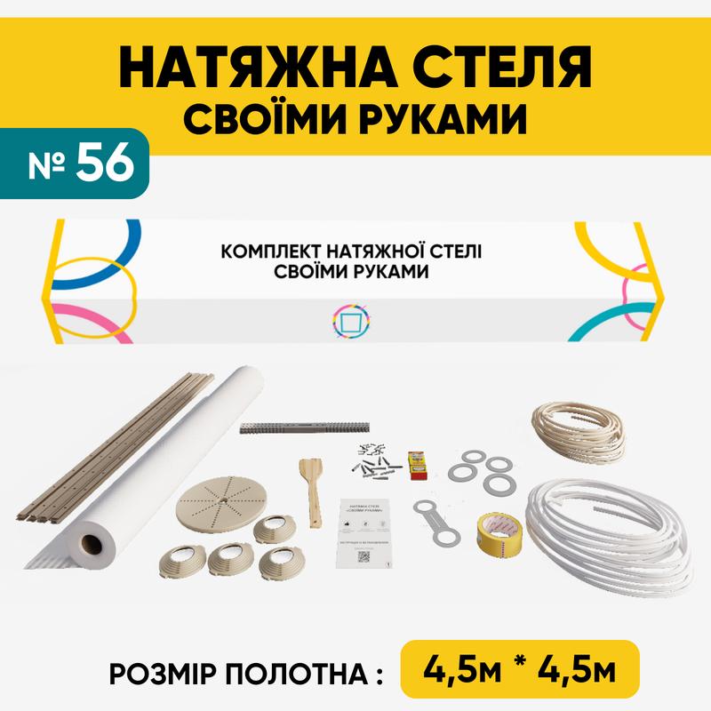 Натяжна стеля "Своїми руками"- це можливість самостійно створити простір своєї мрії. Тепер Ви можете легко та креативно створити елегантну та стильну натяжну стелю без допомоги фахівців та з економією до 75 %! Переваги: - Економія до 75% коштів на монтажних роботах; - Простий монтаж, який не вимагає спеціальних навичок; - Монтаж без використання спеціальної теплової пушки. Набір містить: - біле матове полотно, - профіль ПВХ, - гарпун, - декоративну вставку на профіль, - закладну платформу для люстри, - 4 закладні платформи для точкових світильників 55-110 мм, - термокільце для люстри, - 4 термокільця 75мм, - підвіси, - саморізи, - універсальний обвід для труби, - малярний скотч, - суперклей, - шпатель, - інструкцію для легкого монтажу. Інструкція крок-за-кроком допоможе Вам з легкістю оволодіти процесом, навіть якщо Ви новачок у ремонтних справах. Монтаж натяжної стелі дуже простий та займає лиш кілька годин. Не потрібне професійне теплове обладнання, достатньо мати звичайний фен - для розпрасування складок. 1) Виміряйте розміри кімнати, де бажаєте встановити стелю; 2) Додайте до кожного розміру 20 см; 3) На сайті оберіть комплект, який підходить Вам найкраще. Важливо, щоб запас полотна становив щонайменше 20 см до ширини та довжини кімнати, хоча він може бути і більшим; в телефонній розмові з менеджером при потребі змініть комплектацію під свої потреби) Дозвольте собі зекономити до 75 % коштів на монтажі без економії на якості!