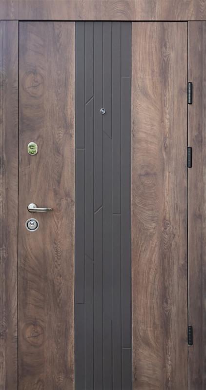 Входная дверь "Люксор" Тип: квартира, офис Производство: Украина Размер: 850х2050, 950х2050 (в этом размере цена увеличиваеися) Покрытие: фрезерованная плита МДФ Толщина МДФ накладок: 16/16 мм, декор с 2 сторон Цвет: Спил дерева - снаружи - вставка софт. Внутри - спил дерева Толщина металла: 1.8 мм. Толщина полотна: Толщина 85 мм, усиленный стальной каркас. Толщина короба: Квадрат труба - 115 мм. Двойной притвор и контур уплотнения Утеплитель: Минеральная вата Isover 50 мм. Уплотнитель: 2 контура вспененного уплотнителя на полотне Фурнитура: 3 наружные петли, глазок, ручка на розетке + броненакладка, антисрезы Верхний замок: Сейфовый Кале 257(Турция), Нижний замок: Кале 252 (Турция),